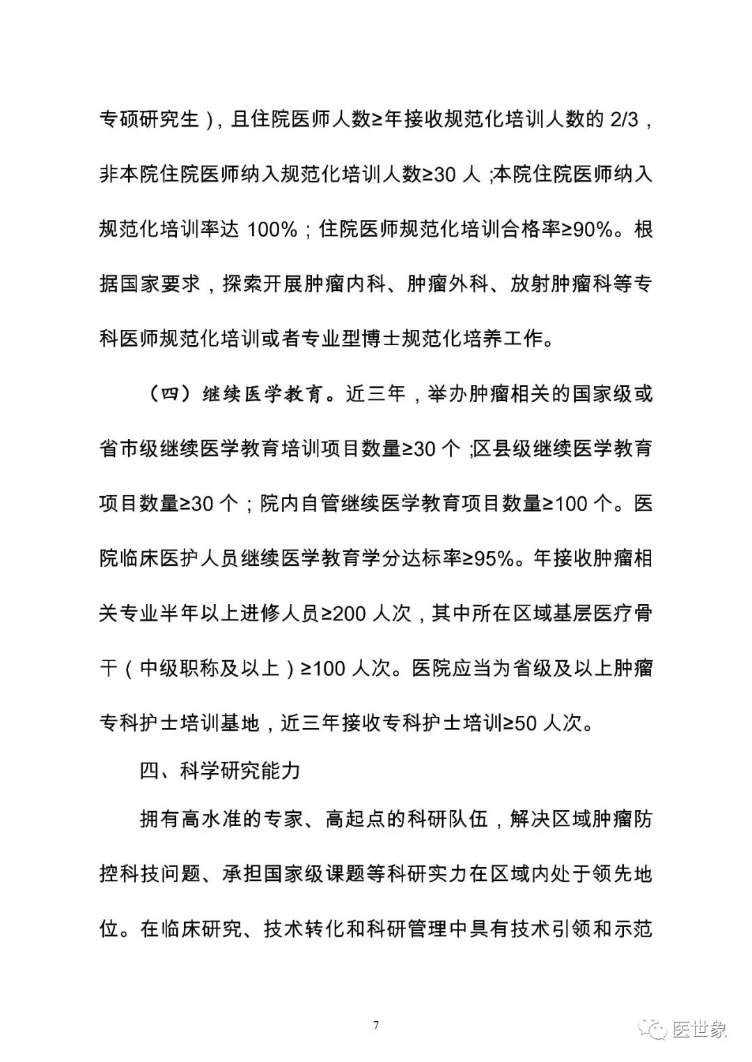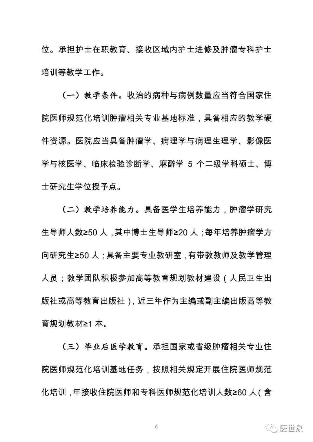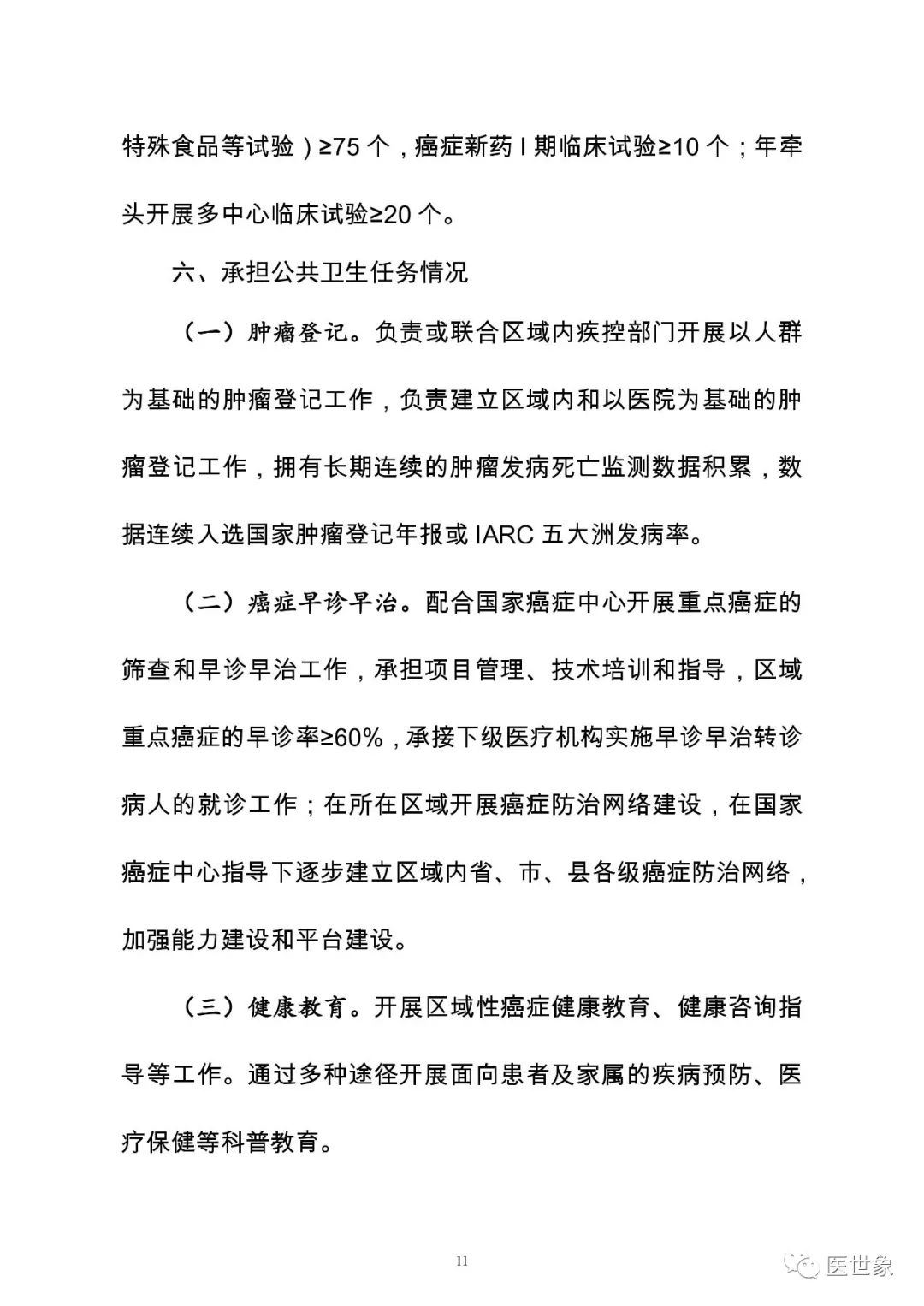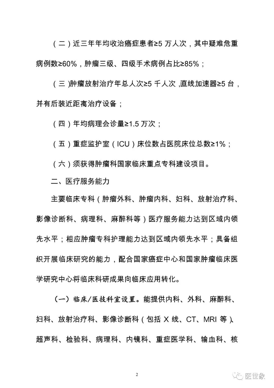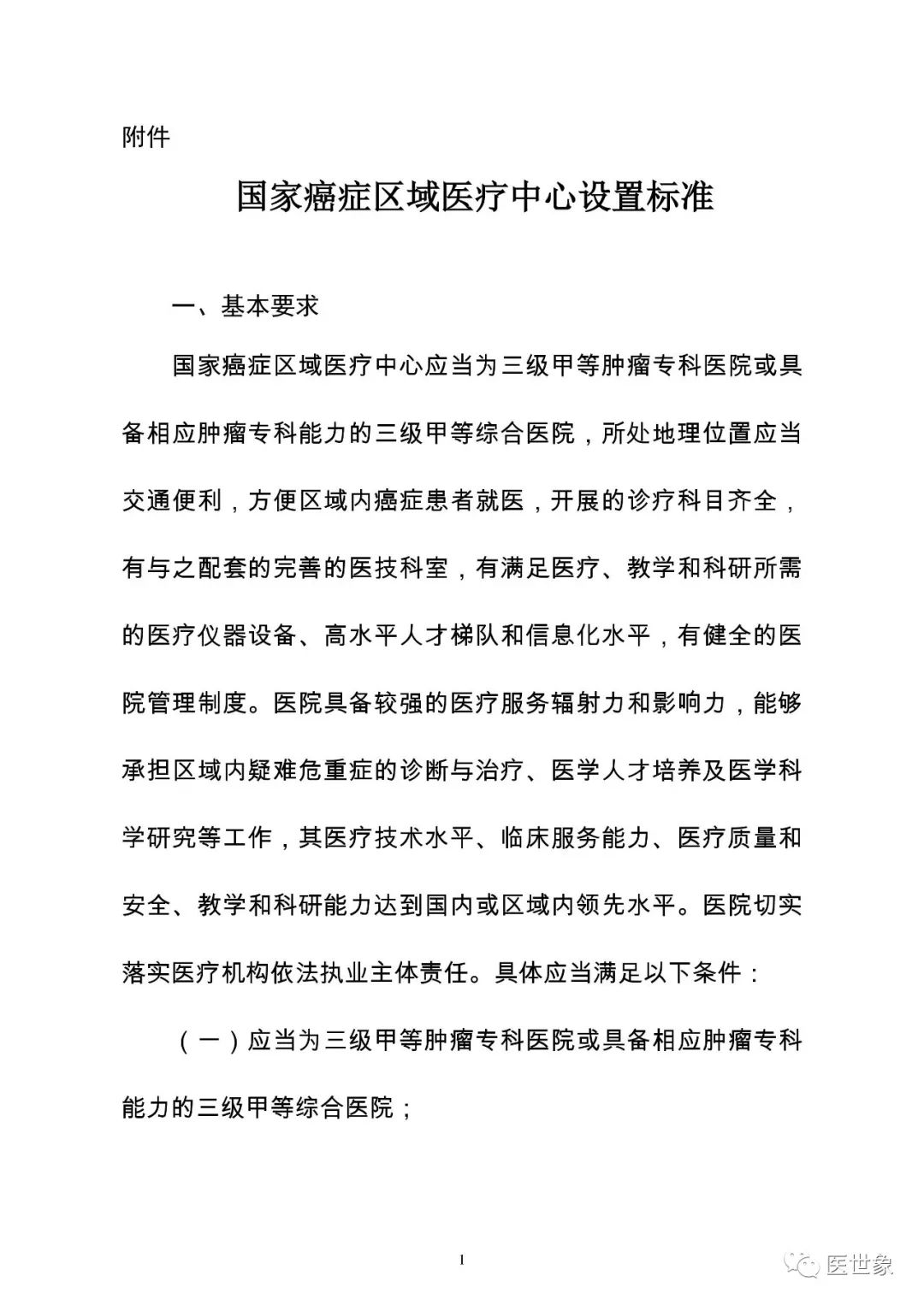国家卫生健康委办公厅关于印发国家癌症区域医疗中心设置标准的通知 国卫办医函〔2019〕697号 各省、自治区、直辖市及新疆生产建设兵团卫生健康委: 为贯彻落实国务院办公厅《关于推进分级诊疗制度建设的指导意见》(国办发〔2015〕70号),根据《“十三五”国家医学中心及国家区域医疗中心设置规划》(国卫医发〔2017〕3号)要求,进一步完善癌症医疗服务体系顶层设计,优化癌症医疗资源区域布局,推动提升区域癌症医疗服务保障能力,助力实现区域分开,我委组织制定了《国家癌症区域医疗中心设置标准》(可从国家卫生健康委网站下载)。现印发给你们,请认真贯彻执行。 附件:国家癌症区域医疗中心设置标准 |