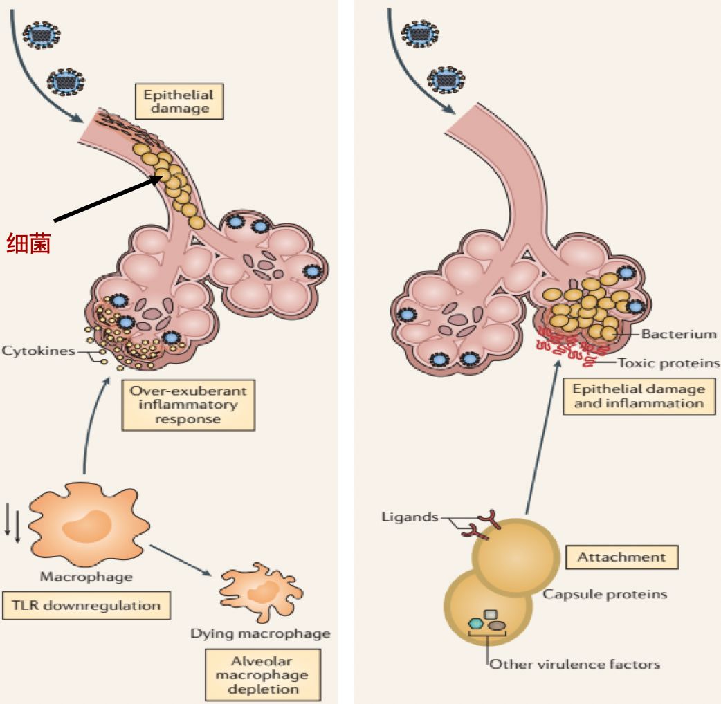流感感染后合并细菌感染的机制 主要机制:1、上呼吸道定植菌迁移至下呼吸道。2、外界的细菌吸入。 细菌感染后加重炎症反应 所以我们也经常讲,感染流感病毒之后,就像打开一个扳机一样,把呼吸道闸门打开了,这时各种病毒、细菌都可能会进入到我们体内,而造成继发的感染。