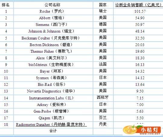 注:拉美包括墨西哥,不含巴西;西欧包括瑞士、挪威。 资料来源:Kalorama Information。 2、主要生产企业及市场份额 全球体外诊断试剂行业市场集中度非常高,2011 年体外诊断产品销售收入排名前 18 的公司合计销售额为 444.35 亿美元,其中领先的 12 家公司体外诊断业务销售收入均在 10 亿美元以上。