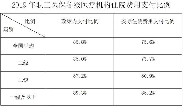 2019年,全国医疗保障系统坚持以习近平新时代中国特色社会主义思想为指导,全面贯彻落实党的十九大和十九届二中、三中、四中全会精神以及中央经济工作会议精神,按照党中央、国务院决策部署,牢记初心使命,坚持以人民为中心的发展思想,坚持稳中求进工作总基调,锐意改革,攻坚克难,推动医疗保障领域各项制度完善、政策到位,医疗保障工作取得了新的成绩。 01 医疗保险 2019年参加全国基本医疗保险[1](以下简称基本医保)135407万人,参保率稳定在95%以上。2019年,全国基本医保基金(含生育保险)总收入24421亿元,比上年增长10.2%[2],占当年GDP比重约为2.5%;全国基本医保基金(含生育保险)总支出20854亿元,比上年增长12.2%,占当年GDP比重约为2.1%;全国基本医保基金(含生育保险)累计结存[3]27697亿元,其中基本医保统筹基金(含生育保险)累计结存[4]19270亿元,职工基本医疗保险(以下简称职工医保)个人账户累计结存8426亿元。 (一)职工基本医疗保险 1、参保人数持续增加。参加职工医保32925万人,比上年增加1244万人,增长3.9%。其中在职职工24224万人,比上年增长3.9%;退休职工8700万人,比上年增长3.9%。在职退休比为2.78,同比持平。 企业、机关事业、灵活就业等其他人员这三类参保人(包括在职职工和退休人员)分别为22267万人、6232万人、4426万人,分别比上年增加747万人、113万人、384万人,分别占参保总人数的67.6%、18.9%和13.4%,构成比例与上年基本一致。职工医保统账结合和单建统筹参保人员分别为30235万人、2690万人,分别占职工医保参保总人数的91.8%和8.2%。 2、基金收支规模扩大。2019年,职工医保基金(含生育保险)收入15845亿元,比上年增长10.7%;基金(含生育保险)支出12663亿元,比上年增长10.4%。2019年,职工医保统筹基金(含生育保险)收入10005亿元,比上年增长10.9%;统筹基金(含生育保险)支出7939亿元,比上年增长9.4%;统筹基金(含生育保险)当期结存2066亿元,累计结存(含生育保险)14128亿元。2019年,职工医保个人账户收入5840亿元,比上年增长10.3%;个人账户支出4724亿元,比上年增长12.2%;个人账户当期结存1116亿元,累计结存8426亿元。 3、享受待遇人次增加。2019年参加职工医保人员享受待遇21.2亿人次,比上年增长7.3%,增幅下降1.7个百分点。其中:普通门急诊18.1亿人次,比上年增长5.8%;门诊慢特病2.6亿人次,比上年增长19.4%;住院0.6亿人次,比上年增长6.8%。 2019年,职工医保参保人员人均就诊6.4次,比上年增加0.2次;住院率18.7%,比上年提高0.4个百分点。其中:在职职工住院率为10.1%,比上年提高0.4个百分点;退休人员住院率为42.5%,比上年提高0.4个百分点。 4、次均住院费用持续增长。2019年,全国职工医保次均住院费用为11888元,比上年增长6.3%。 5、住院报销水平稳中略升。职工医保政策范围内住院费用基金支付85.8%[5],实际住院费用基金支付75.6%,个人负担24.4%。二级、一级以下医疗机构政策范围内住院费用基金支付分别为87.2%、89.3%,分别高于三级医疗机构2.2个、4.3个百分点。 2019年职工医保参保人员医疗总费用14001亿元[6],比上年增长15.3%,其中医疗机构发生费用11971亿元,个人账户在药店支出费用2029亿元。医疗机构发生费用中,退休人员医疗费用7054亿元,比上年增长12.8%;在职职工医疗费用4918亿元,比上年增长16.0%;人均医疗费用3723元,比上年增长12.4%。 (二)城乡居民基本医疗保险[7] 1、参保人数持续增加。2019年,参加全国城乡居民基本医疗保险(以下简称居民医保)102483万人,比上年减少0.3%[8]。其中成年人、中小学生儿童、大学生分别为76942万人、23519万人、2022万人,分别比上年增长16.1%、10.1%、-2.9%,分别占参保总人数的75.1%、22.9%、2.0%。 2、基金收支规模不断扩大。2019年,居民医保基金收入8575亿元,支出8191亿元,分别比上年增长