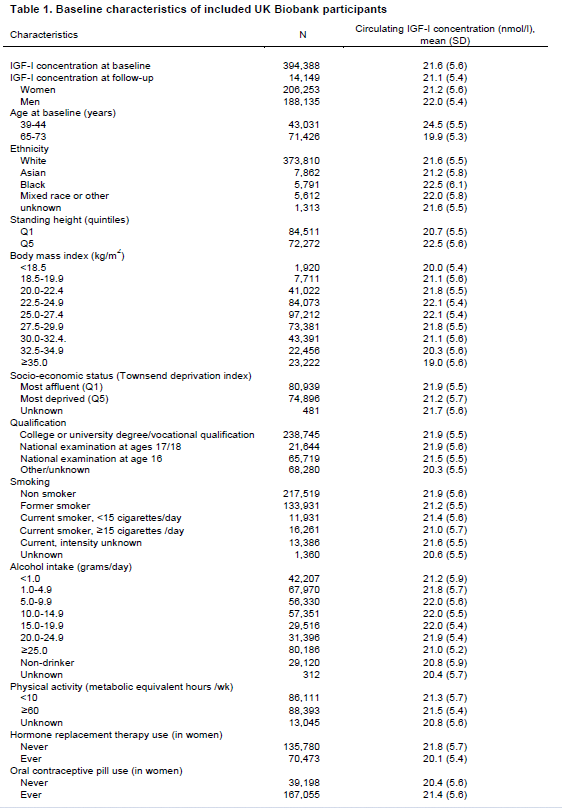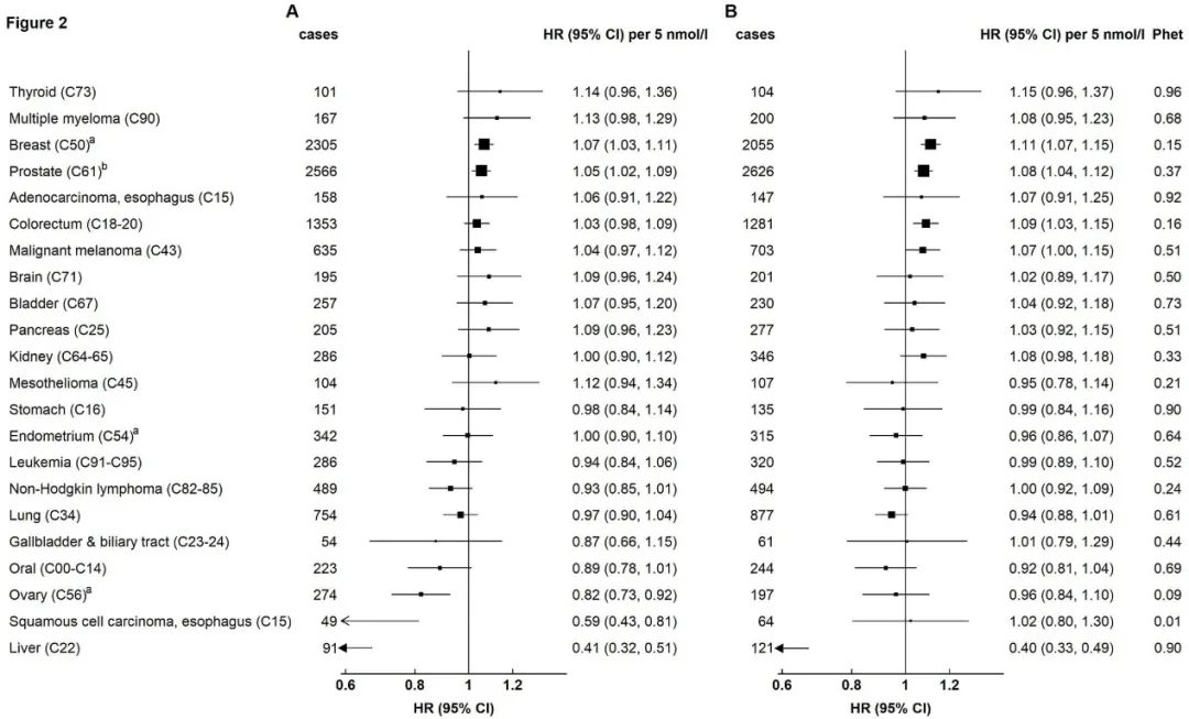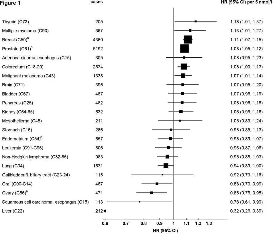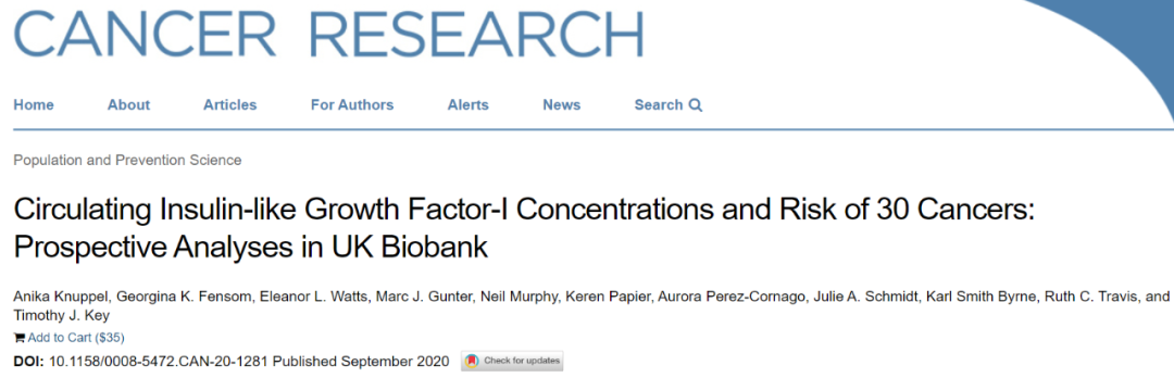 | 胰岛素样生长因子-I(IGF-I),是生长激素在人体中发挥功能必须的一种活性蛋白多肽物质,可以促进正常的细胞增殖、分化和生长,抑制细胞凋亡,还具有类似胰岛素的代谢活性及免疫调节作用等。但当其体内水平及调控过程失衡时,可能会起到反作用,导至癌症的发生。有大量研究曾发现IGF-I浓度与结直肠癌、乳腺癌和前列腺癌的发病风险呈正相关,而与肺癌风险无关。但有关IGF-I在其他包括不太常见的癌症发展中的作用仍尚未可知。近日,一项针对近40万参与者和30种癌症的研究发现,IGF-1水平升高与甲状腺癌、多发性骨髓瘤及恶性黑色素瘤的患病风险增加显著正相关,此外也进一步证实了其与乳腺癌,前列腺癌和结肠直肠癌的相关性。该项研究成果由来自英国牛津大学和法国里昂国际癌症研究机构的研究团队完成,并发表在《Cancer Research》上。  DOI: 10.1158/0008-5472.CAN-20-1281研究人员从英国生物银行数据库中招募了394388名参与者(年龄在39至73岁之间),记录了其身高体重、教育水平、种族等协变量信息后,采集其非空腹血液样品进行IGF-1的血清浓度测定。同时还测量了血清C反应蛋白,糖化血红蛋白,性激素结合球蛋白和睾丸激素浓度等。并在随访中持续记录人群中癌症事件的发生。在平均6.9年的随访期间,共有23412名参与者(5.9%)被新诊断出患有各种类型的恶性肿瘤。参与者的平均循环IGF-1浓度为21.6nmol /L,与白色人种相比,较年轻和高身高的黑人参与者的IGF-I浓度更高。 研究人员使用Cox比例风险回归模型对基线时IGF-I浓度与不同癌症发生的相关性进行评估。在调整协变量后,发现较高的血清IGF-I浓度(每5 nmol / l)与甲状腺癌(风险比HR为1.18)、多发性骨髓瘤(HR=1.13)、女性乳腺癌(HR=1.11)、前列腺癌(HR=1.08)、结直肠癌(1.08)、恶性黑色素瘤(1.07)的发病风险呈明显的正相关性。 高浓度IGF-I对不同癌症发生风险的风险比(HRs) (n=394388)而较高的血清IGF-I浓度与肝癌(HR=0.32)、食道鳞状细胞癌(HR=0.78)、卵巢癌(HR=0.85)和口腔癌(HR=0.88)的发病风险之间呈负相关性。在针对C反应蛋白,糖化血红蛋白,性激素结合球蛋白和睾丸激素的血清浓度进行了敏感性分析调整后,仍得出了定性相似的结果。