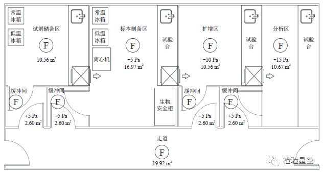 PCR是聚合酶链式反应(Polymerase Chain Reaction)的简称。又称为特异性DNA序列体外引物定向酶促扩增法,这种方法可以把极微量的靶DNA特异地扩增上百万倍,是基因扩增技术的一次重大革新。 PCR技术凭借特异性强、灵敏度高、对检测样品要求低、方便快捷等优点,广泛应用于各种临床诊断。目前国内二级以上的医院都在开展PCR技术的各种临床应用,PCR实验室是承载PCR技术应用的设施,实验室的合理设计才能确保检测结果的可靠性,因此,PCR实验室的设计和建设越来越受到建设单位的重视。 从PCR实验室平面布局、通风空调系统两个方面进行设计要点分析,供设计同行和建设单位的相关人员参考。 壹 PCR实验室平面布局设计要点分析 1、平面功能分区要点分析 根据《临床基因扩增检验实验室基本设置标准》1.1条的要求,PCR实验室一般由试剂储备区、标本制备区、扩增区、扩增分析区4个区域组成。 PCR实验室区域的设置并不是一成不变的,以下几种情况需要说明: ①如果样本在扩增之前需要粉碎处理,则需要增加一个区域用于样品的粉碎; ②如果采用实时荧光PCR法,则扩增区和分析区可以合并为一个区; ③如果采用全自动化PCR分析仪,则标本制备区、扩增区和分析区可以合并为一个区。 以4个区域的实验室设置进行设计要点分析,如图1所示。 ▲图1 典型PCR 实验室工艺平面图 2、实验室功能与设备设计要点分析 (1)试剂储备区 该区域主要完成试剂和主反应混合液的储存、配制和封装工作。所有运送到该区域的试剂和材料不应经过其他区域,试剂和原材料应在本区内储存和制备。本区域的气压应相对外界保持正压。该区域的设备主要是冰箱、天平、混匀器、低速离心机、加样器、可移动紫外灯等。由于该区域有多种试剂,所以“安全”应是平面设计首要考虑因素,平面设计时应保持通风流畅、逃生畅通。首先,实验台布置在房间的两侧,中间的过道全部通向走廊便于疏散。同时根据国际人体工程学的标准,实验台与实验台通道设计为1500mm,中间的通道可满足两边坐人中间过人的要求。 (2)标本制备区 该区域的功能是样本的保存、核酸提取和贮存、样本加入扩增反应管和测定DNA的合成。样本应直接运送至该区并储存在本区内,不得经过其他区域。对于气流压力的控制,由于在本区内加样操作可能产生气溶胶,为避免气溶胶扩散出去对外界造成污染,本区应对外界保持负压;同时本区相对于扩增反应混合物配制和扩增区以及扩增产物分析区为正压,以避免从邻近区进入本区的气溶胶污染。 该区域的设备主要是生物安全柜、加样器、台式高速离心机、台式低速离心机、水浴锅、冰箱、混匀器和可移动紫外灯等。其中需要注意的是,生物安全柜最好选用B2型,这种生物安全柜所有的吸入气流和垂直气流都经过高效过滤器过滤后排到室外,不再进入生物安全柜循环或者返回该区域,这种生物安全柜可避免提取核酸在柜内反复循环,造成标本之间交叉“污染”,出现假阳性结果。 (3)扩增区 该区域的功能是DNA扩增和扩增片段的测定。此外,反应混合液(来自试剂贮存和制备区)制备成反应混合液和已制备的DNA模板(来自标本制备区)的加入等也可在本区内进行。对于气流压力的控制,相对于邻近区域为负压,以避免气溶胶从本区漏出。为避免气溶胶所致的污染,应尽量减少在本区内不必要的走动。个别操作如加样等应在超净台内进行。 该区域的设备主要是核酸扩增热循环仪、加样器、超净台等。其中热循环仪的电源应专用,并配备一个稳压电源或UPS,以防止由于电压的波动对扩增测定的影响。 (4)分析区 该区域的功能是扩增产物的分析。该区域可能会用到某些可致基因突变的有毒物质,应特别注意实验人员的安全防护。对于气流压力的控制,该区域是PCR实验的最后一步,