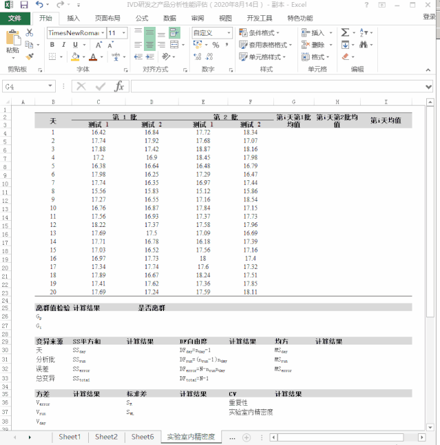 1. IVD研发质量的重要性IVD(全称invitro diagnostic products),是指医疗器械、体外诊断试剂,以及药品,IVD作为医疗器械的分支,有特有的界定和法规监管。 IVD监管的最高级法律是《医疗器械监督管理条例》,条例就医疗器械产品注册与备案、医疗器械生产、医疗器械经营与使用、不良事件的处理与医疗器械的召回、监督检查等方面作了规定,条例及相关法规的核心是为了保证医疗器械的安全、有效,保障人体健康和生命安全。 IVD产品安全、有效性不足导至的后果,不像药品,或是植入性医疗器械不良事情引起的后果直观,药品和植入性医疗器械与人体直接接触,很直接地影响到人的生产健康,即俗话说的人命关天。 而IVD产品作为体外检测产品,检验指标仅作为参考,需要结合其它指标综合判断,检验指标的重要性和指标错误的危险性就不那么直观。但从以下两个例子可以看出,没有相应的检验指标,或是检验指标结果错误,导至的后果也可严重影响人命安全。 2016年X医院急诊科,患者34岁因腹痛、纳差至急诊,给予5%GNS,后诊断糖尿病酮症酸中毒,经抢救无效死亡。(应排除高血糖情况下用GNS补液) 2012年X医科大学附属医院血液科,患者因再障合并甲状腺功能亢进入院。6天肺部感染后昏迷,查静脉血糖为25mmol/L。高渗性昏迷、经抢救无效死亡。(指末血糖是5.5mmol/L) 医疗器械的安全、有效归结为产品质量,产品质量的首要把关人和责任人在研发,研发决定了IVD产品的安全性和有效性即是质量,其它部门影响或改进了IVD产品质量。统计结果显示,产品70%的质量问题是由设计不当引起的,所以我们应该在设计环节入手,优先解决设计的质量问题,这样成本最小,效果最好。 而在IVD研发中,设计合格的第一指标就是IVD产品的分析性能合格,下面详细介绍分析性能评估和验证的依据,分析性能评估中的精密度评估方法。 2. IVD产品分析性能评估和验证的依据。IVD产品分析性能评估和验证的依据主要有四类来源。 一是权威版本,美国临床和实验室标准协会(CLSI)发布的EP系列标准。 二是专业版本,中华人民共和国国家卫生和计划生育委员会发布的WS/T标准。 三是应用版本,中国合格评定委员会(CNAS)发布的标准。 四是监管版本,全国医用临床检验实验室和体外诊断系统标准化技术委员会(SAC/TC136)发布的YY/T标准。 除了上述四种分析性能评估验证方法标准来源外,作为医疗器械监督管理机构之一的“国家药品监督管理局医疗器械技术审评中心”也在2019年9月发布了《定量检测试剂性能评估注册技术审查指导原则(征求意见稿)》,医疗器械相关产品的注册资料需要满足指导原则要求。 作为IVD产品研发人员,上述几类来源的同类标准,均应该去学习和了解,可以根据标准发布的前后顺序安排,不同来源标准内容完整性和详实程度不一致,会有不同的立场和侧重点,可以加深标准的理解,有助于建立适用企业内部的分析性能评估方法,更能满足监管机构的要求,减少产品注册过程中的发补,另外由于此类的标准由检验医学界专家编制,有助于把握和了解用户需求,从而完善产品研发阶段的设计。 下文以《体外诊断检验系统 性能评价方法 第1部分:精密度》为依据,总结精密度评估的重点内容,使用excel计算实验室内精密度、实验室间精密度、95%置信区间的方法。 3.定量试剂分析性能评价方法(精密度)医学实验室对患者样品进行检验,一般情况下对每份样品只做一次检验就发出报告,因此要求检验结果必须具有良好或足够的精密度。这也是行业内将精密度列为产品分析性能第一位的原因。 3.1精密度相关定义① 性能评价:对预期成为体外诊断医疗器械的产品,为建立或验证其性能声明而进行的研究。(与性能评价相区别的是临床评价,临床评价属于确认,性能评价属于验证)② 测量精密度:在规定条件下,对同一或相似被测对象重复测量得到测量示值或测得量值间的一致程度。 (测量精密度通常用我们熟悉的变异系数CV和标准差S来表述) ③ 测量重复性:在一组测量条件下的测量精密度,包括相同测量程序、相同操作者、相同测量系统、相同操作条件和相同地点,并且在短时间段内对同一或相似被测对象重复测量。 (在检验实验室里所常用的批内精密度、序列内精密度就是指测量重复性) ④ 中间精密度:在一组测量条件下的测量精密度,这些条件包括相同的测量程序、相同地点并且对相同或相似的被测对象在一长时间段内重复测量,但可包含其它相关条件改变。 (与重复性的差别在于测量结果是在一长时间段内收集的) ⑤ 测量再现性:在包括了不同地点、不同操作者、不同测量系统的测量条件下对同一或相似被测量对象在长时间重复测量的测量精密度。 (在检验实验室里所常用的实验室间精密度就是指测量再现性) 根据上述定义,精密度不能简单粗暴地理解为测多个重复的CV,这会导至我们分析性能评估不完整,对产品的实际性能认识不清晰,如只考虑重复性类精密度,则发现不了产品对环境、仪器、时间、操作者的敏感性。 3.2精密度评估总则① 总体要求:性能评价的计划、实施、评价和文件化等相关过程要符合YY/T 1441的规定。制造商应规定所有管理和实施IVD性能评估相关人员的责任和相互关系,并确保具备充足的资源。制造商设计评价方案,并进行测试,做好相关记录,所有文件和记录作为该产品技术文件的一部分