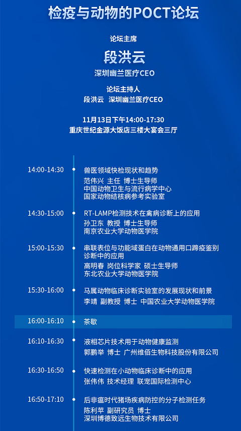 由中国医疗器械行业协会现场快速检测(POCT)分会、重庆市江北区人民政府主办的 2020中国POCT年会 于2020年11月12-14日在重庆市召开 本次会议是我国POCT业界最盛大的节日,邀请国家卫生健康委员会、科技部、美国AACC组织负责人、中国科学院、国家药品监督管理局(NMPA)、中国医学科学院等有关部门的相关机构领导、国内外知名专家学者与会作专题报告。 2020年POCT年会——检疫与动物的POCT邀请了动物临床诊断领域当中七位重量级的专家和技术负责人。 本次会议也是第一次集大动物猪、牛羊、马驴,小动物犬猫,家禽于一体的行业会议。更是第一次将动物诊断领域和人医检验领域做跨界探讨和交流的先行者。 会议现场 七位嘉宾分别从各自熟悉领域做精彩的课题分享 范伟兴:《兽医领域快检现状和趋势》 孙卫东:《RT-LAMP技术在禽病诊断上的应用》 高明春:《串联表位与功能域蛋白在动物通用口蹄疫鉴别诊断中的应用》 李靖:《马属动物临床诊断实验室的发展现状和前景》 郭鹏举:《液相芯片技术用于动物健康监测》 张伟伟老师:《快速检测在小动物临床诊断中的应用》 陈利苹博士:《后非瘟时代猪场疾病防控的分子检测任务》 中国POCT大会主席康熙雄教授授予分论坛负责人段洪云荣誉证书 大会主席与嘉宾讲师合影 会议现场 动物领域包括四部分 ►最大的一部分涉及到疫控中心,主要针对于传染病的检测。 ►第二部分包括小动物领域尤其是伴侣动物犬猫,针对的市场是以宠物医院为主。 ►第三部分是家禽类,主要是禽病比如禽流感等。 ►第四部分针对的是特殊的实验动物,包括实验兔、鼠、猴等。 涉及的领域范围很广,包括传染病的检测,激素检测等。 动物领域更需要的在应用场景中对于现场快速检测是非常需要,兽用POCT的发展一定会在该领域发挥非常重要的左右,跨界的交流和合作一定会有更大的可能性。 |