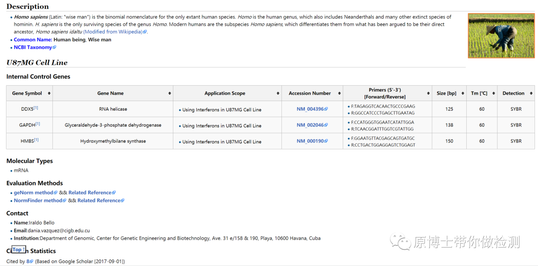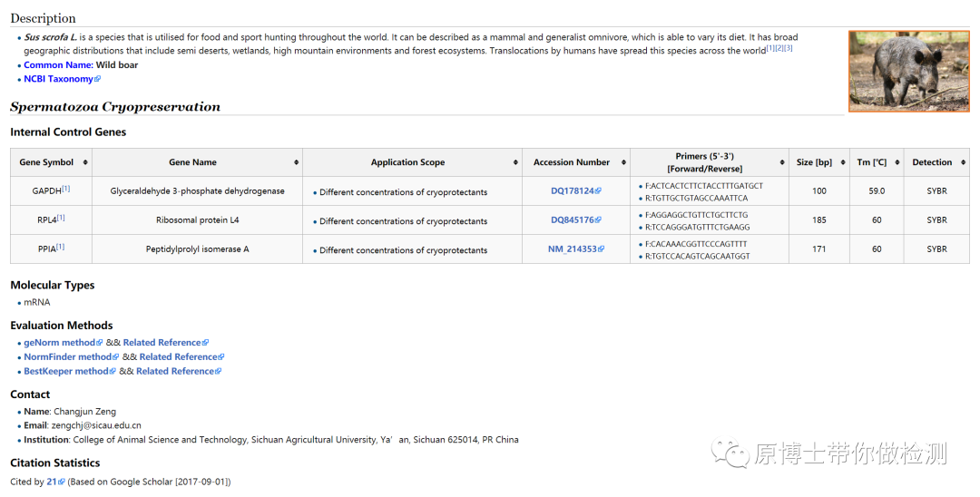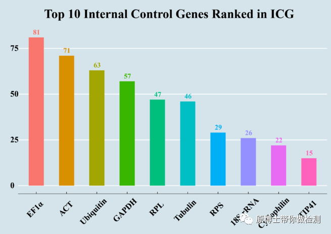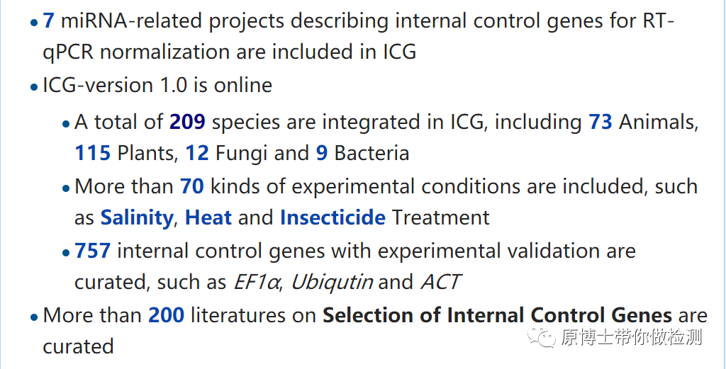 二、选择适合自己的内参基因 没有一种内参基因在任何物种、任何器官、任何生理状态下都是恒定的,我们需要根据自己的试验目的和样本类型去筛选最适合的内参基因。 1.ICG 北京基因组所生命与健康大数据中心开发了国际上首个实时定量PCR内参基因知识库——ICG(http://icg.big.ac.cn/index.php/Main_Page),对经生物学实验手段鉴定出的内参基因及其应用场景实现了有效的挖掘、整合及注释。 目前这个网站已经收录了 ICG知识库中动物的物种信息 每个物种信息中包含了基本描述、内参适用的样本类型、内参基因的信息(名称、应用、genbank的accession号、引物序列,Tm温度和qPCR类型等信息)、内参基因的类型、评估方法等。 ICG知识库中人的物种信息(http://icg.big.ac.cn/index.php/Homo_sapiens) ICG知识库中猪的物种信息(http://icg.big.ac.cn/index.php/Sus_scrofa) 这个网站真是“一站式”解决内参基因的烦恼,从此“一站在手,内参无忧”。 2.其他常用工具 geNorm、NormFinder和BestKeeper是目前最常用的用于评估内参基因稳定性的软件。大家可以自行学习。 geNorm(https://genorm.cmgg.be/) NormFinder(https://moma.dk/normfinder-software) BestKeeper(https://www.gene-quantification.com/bestkeeper.html) 3.人类的内参基因 E. Eisenberg and E.Y. Levanon, Trends in Genetics, 29 (2013)(DOI:https://doi.org/10.1016/j.tig.2013.05.010)这篇文章中作者基于对NGS的RNA-seq数据分析列出了6万多种管家基因。有兴趣的可以去研究 (下载链接:https://www.tau.ac.il/~elieis/HKG/)。 4.商品化检测方法 目前很多公式都有成品的管家基因检测方法,可以买回来试试。
