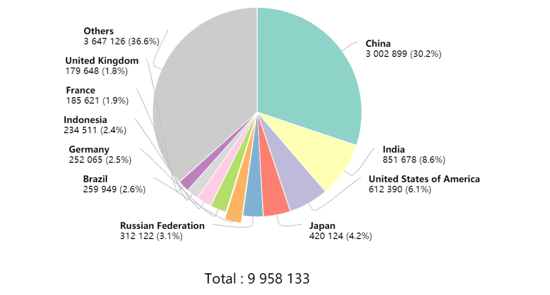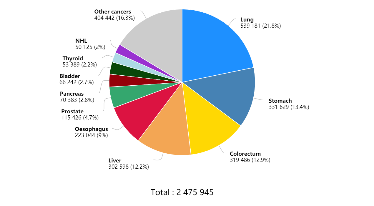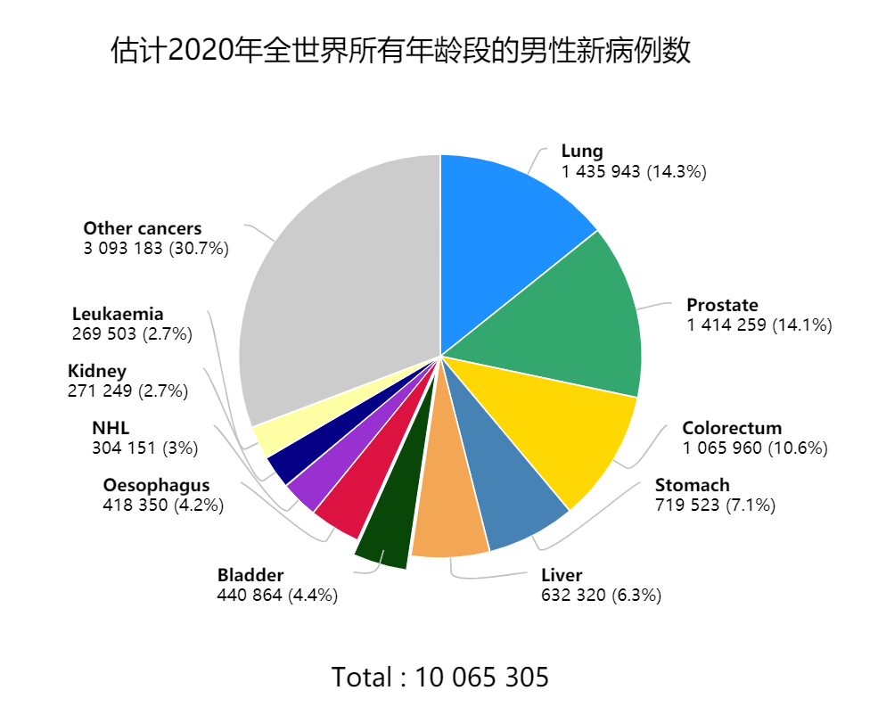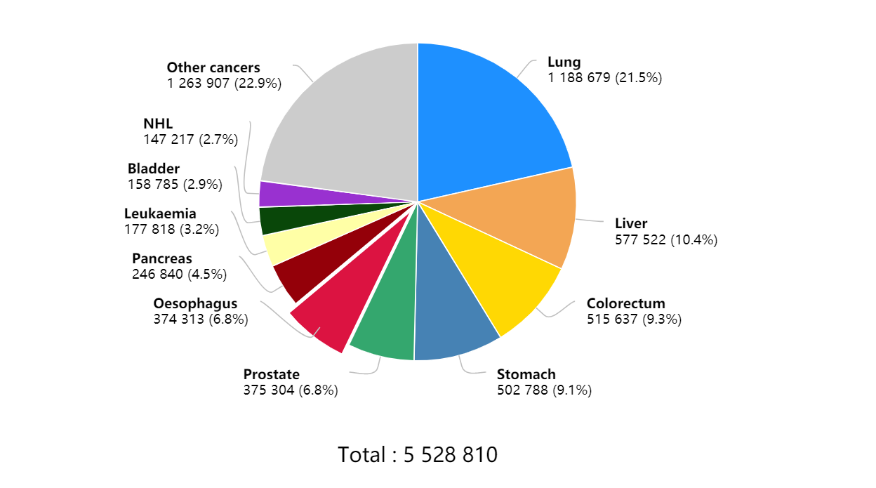 近日,世界卫生组织国际癌症研究机构(IARC)发布了2020年全球最新癌症负担数据。预测了全球185个国家36种癌症类型的最新发病率、死亡率情况,以及癌症发展趋势。 这项最新预测数据显示,2020年全球新发癌症病例1929万例,其中男性1006万例,女性923万例;2020年全球癌症死亡病例996万例,其中男性553万例,女性443万例。 全球乳腺癌新发病例高达226万例,超过了肺癌的220万例,乳腺癌取代肺癌,成为全球第一大癌。 2020年中国新发癌症病例457万例,其中男性248万例,女性209万例,2020年中国癌症死亡病例300万例,其中男性182万例,女性118万例。 2020年全球新发癌症病例1929万例,其中中国新发癌症457万人,占全球23.7%,由于中国是世界第一人口大国,癌症新发人数远超世界其他国家。癌症新发人数前十的国家分别是:中国457万,美国228万,印度132万,日本103万,德国63万,巴西59万,俄罗斯59万,法国47万,英国46万,意大利42万。2020年全球癌症死亡病例996万例,其中中国癌症死亡人数300万,占癌症死亡总人数30%,主要由于中国癌症患病人数多,癌症死亡人数位居全球第一。2020年癌症死亡人数前十的国家分别是:中国300万,印度85万,美国61万,日本42万,俄罗斯31万,巴西26万,德国25万,印度尼西亚23万,法国19万,英国18万。 之前,肺癌一直是全球发病率最高的癌症,而2020年最新数据显示,乳腺癌新增人数达226万,肺癌为220万,乳腺癌正式取代肺癌,成为全球第一大癌症。全球发病率前十的癌症分别是:乳腺癌226万,肺癌220万,结直肠癌193万,前列腺癌141万,胃癌109万,肝癌91万,宫颈癌60万,食管癌60万,甲状腺癌59万,膀胱癌57万,这十种癌症占据新发癌症总数的63%。 2020年全球癌症死亡病例996万例,其中肺癌死亡180万例,远超其他癌症类型,位居癌症死亡人数第一。癌症死亡人数前十的癌症分别是:肺癌180万,结直肠癌94万,肝癌83万,胃癌77万,乳腺癌68万,食管癌54万,胰腺癌47万,前列腺癌38万,宫颈癌34万,白血病31万,这十种癌症占据癌症死亡总数的71%。2020年全球男性新发癌症1007万例,占总数的52%,全球男性新发病例数前十的癌症分别是:肺癌144万,前列腺癌141万,结直肠癌107万,胃癌72万,肝癌63万,膀胱癌44万,食管癌42万,非霍奇金淋巴瘤30万,肾癌27万,白血病27万,这十种癌症占男性新发癌症总数的近70%。2020年全球男性癌症死亡553万例,占总数的56%,其中肺癌死亡人数达119万人,远超其他癌症类型,2020年全球男性癌症死亡人数前十的癌症分别是:肺癌119万,肝癌58万,结直肠癌52万,胃癌50万,前列腺癌38万,食管癌37万,胰腺癌37万,白血病18万,膀胱癌16万,非霍奇金淋巴瘤15万,这十种癌症占男性癌症死亡总数的近77%。2020年全球女性新发癌症923万例,占总数的48%,2020年女性乳腺癌新发226万例,远超女性其他癌症类型。全球女性新发病例数前十的癌症分别是:乳腺癌226万,结直肠癌87万,肺癌77万,宫颈癌60万,甲状腺癌45万,子宫内膜癌42万,胃癌37万,卵巢癌31万,肝癌27万,非霍奇金淋巴瘤24万,这十种癌症占女性新发癌症数的71%。2020年全球女性癌症死亡443万例,占总数的44%,2020年全球女性癌症死亡人数前十的癌症分别是:乳腺癌68万,肺癌61万,结直肠癌42万,宫颈癌34万,胃癌27万,肝癌25万,胰腺癌22万,卵巢癌21万,食管癌17万,白血病13万,这十种癌症占女性癌症死亡总数的近74%。2020年中国癌症新发病例457万例,乳腺癌在全球发病数高居第一,但在中国则在肺癌、结直肠癌、胃癌之后,位居第四。2020年中国癌症新发病例数前十的癌症分别是:肺癌82万,结直肠癌56万,胃癌48万,乳腺癌42万,肝癌41万,食管癌32万,甲状腺癌22万,胰腺癌12万,前列腺癌12万,宫颈癌11万,这十种癌症占新发癌症数的78%。2020年中国癌症死亡人数300万,肺癌死亡人数遥遥领先,高达71万,占癌症死亡总数的23.8%。 2020年中国癌症死亡人数前十的癌症分别是:肺癌71万,肝癌39万,胃癌37万,食管癌30万,结直肠癌29万,胰腺癌12万,乳腺癌12万,神经系统癌症7万,白血病6万,宫颈癌6万,这十种癌症占癌症死亡总数的83%。 2020年中国男性新发癌症病例数248万,占总数的54%,其中肺癌、胃癌、结直肠癌、肝癌发病数最多。 2020年中国男性癌症新发病例数前十的癌症分别是:肺癌54万,胃癌33万,结直肠癌32万,肝癌30万,食管癌22万,前列腺癌12万,胰腺癌7万,膀胱癌7万,甲状腺癌5万,非霍奇金淋巴瘤5万,这十种癌症占男性新发癌症数84%。2020年中国男性癌症死亡病例数182万,占总数的61%,其中肺癌、肝癌、胃癌、食管癌死亡数最多。 2020年中国男性癌症死亡病例数前十的癌症分别是:肺癌47万,肝癌29万,胃癌26万,食管癌21万,结直肠癌16万,胰腺癌7万,前列腺癌5万,白血病4万,神经系统癌症3万,非霍奇金淋巴瘤3万,这十种癌症占癌症死亡总数的88%。2020年中国女性新发癌症病例数209万,占总数的46%,乳腺癌、肺癌、结直肠癌发病人数最多。2020年中国女性癌症新发病例数前十的癌症分别是:乳腺癌42万,肺癌28万,结直肠癌24万,甲状腺癌17万,胃癌15万,宫颈癌11万,肝癌11万,食管癌10万,子宫内膜癌8万,卵巢癌6万,这十种癌症占女性新发癌症数81%2020年中国女性癌症死亡病例数118万,占总数的39%,肺癌、结直肠癌、胃癌、乳腺癌死亡数最多。2020年中国女性癌症死亡病例数前十的癌症分别是:肺癌24万,结直肠癌12万,胃癌12万,乳腺癌12万,肝癌10万,食管癌9万,宫颈癌6万,胰腺癌5万,卵巢癌4万,神经系统癌症3万,这十种癌症占癌症死亡总数的83%。2020年全球最新癌症负担数据中一个