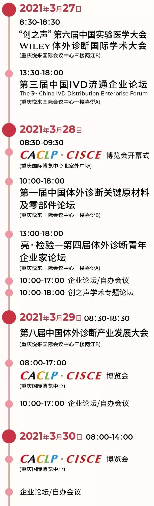 以CACLP品牌的力量 赋能体外诊断“智”造前行 由智奥瑞和(上海)展览有限公司主办的第十八届中国国际检验医学暨输血仪器试剂博览会(简称“CACLP”)、第一届中国国际IVD上游原材料暨制造流通供应链博览会(简称“CISCE”)将于2021年3月28日-30日在重庆国际博览中心举行。 CACLP是体外诊断行业旗帜性博览盛会,也是体外诊断产业发展的风向标。该会以信息量大、人气高、专业性强、规模大为特点,对体外诊断产品的宣传、销售、转化、提升、合作起到了不可替代的作用。每年展会吸引近十万人次的海内外相关领域专家、学者、企业家、生产企业、经销企业、投行、检验医学工作者、实验医学工作者、大专院校专家学者等领域人士参展、参会、参观。 自2021年CACLP重庆会起,将同期组建IVD上游原材料暨制造流通供应链博览会(CISCE),CISCE每年举办一届,与CACLP同时间同地点举办。 CISCE将传承CACLP的优良传统,坚持以为本土IVD上游原材料及供应链企业提供优质的服务为最高宗旨,以助力IVD上游原材料及供应链企业发展进步为己任,以不断的为企业提升品质品牌,对接国际市场为前进方向。我们相信首届中国(国际)体外诊断上游原材料暨制造流通供应链博览会的举办,定将为相关企业产品品牌品质和影响力的提升起到积极的作用,为中国体外诊断全产业链的发展进步起到积极的推动和助力作用。 届时,由全国卫生产业企业管理协会实验医学分会、Wiley出版集团、上海市实验医学研究院共同主办的“‘创之声’第六届中国实验医学大会/Wiley体外诊断国际学术大会"及病理、输血、检验、监管等专题学术论坛和由全国卫生产业企业管理协会医学检验产业分会、上海市实验医学研究院产业发展研究所共同主办的“第八届中国体外诊断产业发展大会”、“亮·检验-第四届体外诊断青年企业家论坛”、“第三届中国IVD流通企业论坛”、“第一届中国体外诊断上游原材料论坛” 等会议亦将同期举行。 时间地点 展览时间:2021年3月28日-3月30日 2021年3月28日8:30-9:30 开幕式 2021年3月28日9:30-16:30 博览会 2021年3月29日9:00-16:30 博览会 2021年3月30日9:00-13:00 博览会 注:3月26-27日8:00-18:00展商布展,3月30日14:00-24:00撤展。 地点:重庆国际博览中心 同期会议 (以上会议时间以最终通知为准) 展商名录 学术会议支持参展单位 参展企业持续增加•名单未完待续 |