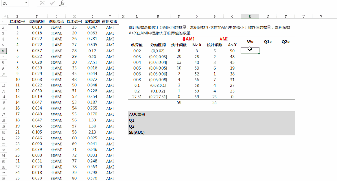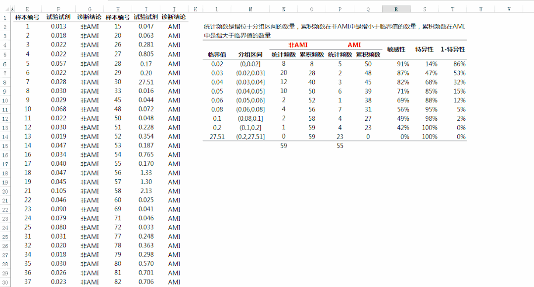 ROC的统计可直接使用MedCalc和SPSS得出,详细的计算过程对ROC的理解更有益处,以cTnI测量的临床数据为例,使用excel进行ROC统计分析。