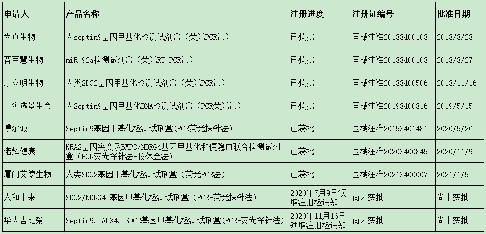 早筛网讯:1月13日,据国家药品监督管理局政务服务门户网站消息,厦门艾德生物“人类SDC2基因甲基化检测试剂盒(荧光PCR法)”正式获批。据艾德生物官方微信消息,该试剂盒商品名为“畅青松”,主要用于肠癌早期发现,可居家采样2.5g,3个自然日出报告。 癌症早筛毫无疑问是近两年分子诊断/液体活检领域最热门的赛道之一,有大量的企业布局癌症早筛这个赛道。而其中肠癌因为其明确的早筛临床意义,以及相对成熟的技术路径,目前相对其他癌种的早筛产品走的更快。其中一个参照标准是医疗器械注册证的获批情况。目前,除了刚获批的艾德生物的试剂盒以外,还有哪些肠癌早期检测相关的试剂盒(获批用途可能不一致)呢?小编通过查询NMPA官网梳理了以下信息,供各位读者参考: