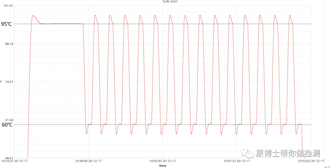 检测人心中最理想的诊断试剂就是又快又准又便宜,但是通常情况下鱼和熊掌不可兼得。作为检测人我也期待着这样的产品早日出现,让我们脱离苦海,但是在这样的产品推出之前,还是希望相关公司在产品研发时能够考虑以下的因素。 一、快速qPCR试剂的评价 快速qPCR的评价应与常规qPCR使用相同的评价标准,重复性(精密度)、分析敏感性(最低检测限)、分析特异性、诊断敏感性和诊断特异性。参见 诊断试剂评价系列2-核酸检测方法(更正)尤其是最低检测限的参数必须明确,否则很容易翻车。 二、快速qPCR的仪器评价 现在有些厂家基于现有的qPCR平台推出了快速qPCR产品。这就要求所使用的qPCR仪器能够满足基本的性能要求,参见 如何系统全面的评价qPCR仪。 三、qPCR的鲁棒性1.鲁棒性/稳健性 Robustness: 指在测试过程中,测试条件发生微小变化时,检测方法不受其影响的能力。 用于衡量检测方法在其参数发生少量但可预料的改变时不受影响的能力;在正常使用中,可显示方法的可靠性。最有可能影响检测qPCR鲁棒性/稳健性的因素包括定量(连续性)因素(温度等)。那么温度是如何影响的试剂性能的呢? 2.荧光定量PCR仪的温度性能试验相关指标 (1)温度示值误差 :在温度技术指标校准程序中, 实时荧光定量 PCR 分析仪均热块设定温度与所有采样测量孔温度平均值之差。 (2)温度均匀度 :在温度技术指标校准程序中, 实时荧光定量 PCR 分析仪均热块所有采样测量孔温度平均值的最大值与最小值之差。 温度示值误差与均匀度* (3)温度最大过冲量 :在温度技术指标校准程序中, 荧光定量 PCR 仪均热块温度升高或降低至设定值过程中,所有采样测量孔温度超出设定值的最大幅度。仪器的温度过冲取决于每种仪器的固有性能,随着仪器的老化,温度过冲量也会发生变化。 温度最大过冲量* 四.qPCR程序下的温度性能评价试验 1.快速qPCR程序: 根据某试剂盒的快速程序使用国产某品牌qPCR仪器:预变性95℃,3min;95℃,5sec,60℃,13sec,45个循环。在本测试中循环数设为15个循环,如下图所示,虽然我们在仪器的程序中设置了相应的温度和时间,但是由于温度的过冲,程序运行过程中的温度和时间与设置的温度和时间存在较大的差异。 快速qPCR程序* 2.快速qPCR 95℃下的温度过冲 95℃ 3min阶段温度最大过冲2.54℃,过冲时间36s,仪器稳定在95℃的时间为2min39s;而在95℃,5sec循环阶段,温度最大过冲3.03℃,过冲时间12s;这意味着在循环阶段的实际运行过程中从未达到过稳定的95℃ 5s。 95℃温度过冲* 95℃温度过冲* 3.快速qPCR 60℃下的温度过冲 60℃,13sec 循环阶段,温度最大过冲2.72℃,过冲时间11s;温度稳定在60℃的时间为8s,这意味着在循环阶段的实际运行条件为60℃ 8s。 60℃温度过冲* 4.荧光定量PCR仪的温度性能指标试验 以15个监测点的温度为例进行分析(布点如下图):运行程序为:30℃,1min;95℃,1min;30℃,1min;90℃,1min;50℃,1min;70℃,1min;60℃,1min;30℃,1min。 95℃温度曲线 95℃温度性能* 60℃温度曲线 60℃温度性能* 不同温度下的温度性能。
