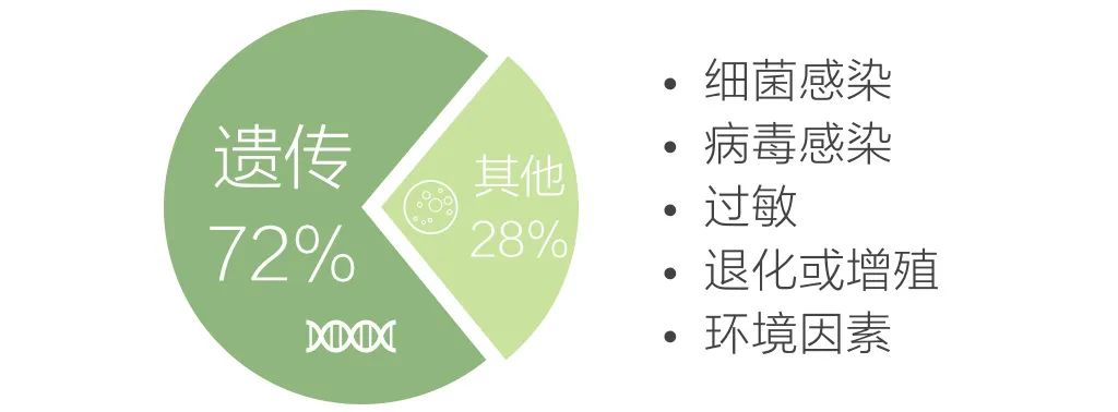 不同的国家/地区所划定“罕见病”的范围因国情而异,并不存在全球统一的患病率标准。“罕见病”的定义并非只为解决医学问题,更是为应对威胁人类健康的公共卫生问题提供政策制定的范围与依据。 02 罕见的困境 截止2018年10月,全球最大的罕见病数据库Orphanet共收录6172种罕见病,约占全部人类疾病的10%。其中,约72%的罕见病是遗传物质的结构改变或调控异常造成的,也就是遗传病。 引起罕见病的其他因素包括 感染、过敏、退化或增殖,以及环境因素 图 | 豌豆Sir 罕见病对人体的影响通常涉及多系统、多脏器;病程往往呈慢性、进行性、耗竭性地发展,甚至造成残疾或危及生命。 在Orphanet数据库中,5018种(81.3%)罕见病记录了发病时间的数据,其中: