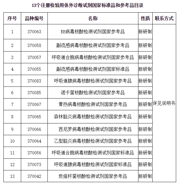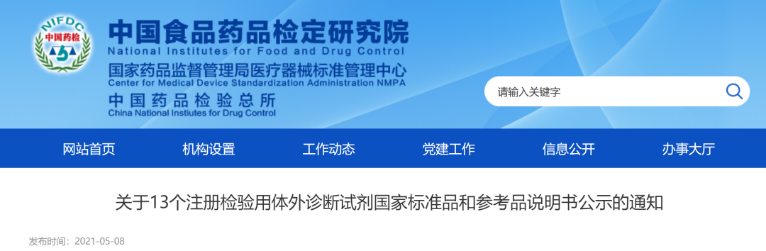 58日,中检院发布公告称,已完成13个注册检验用体外诊断试剂国家标准品和参考品的研制,现就说明书内容向社会公示,征求意见,详见附件。请于2021年5月21日前将意见反馈中国食品药品检定研究院体外诊断试剂所。相关品种及联系方式见下表。