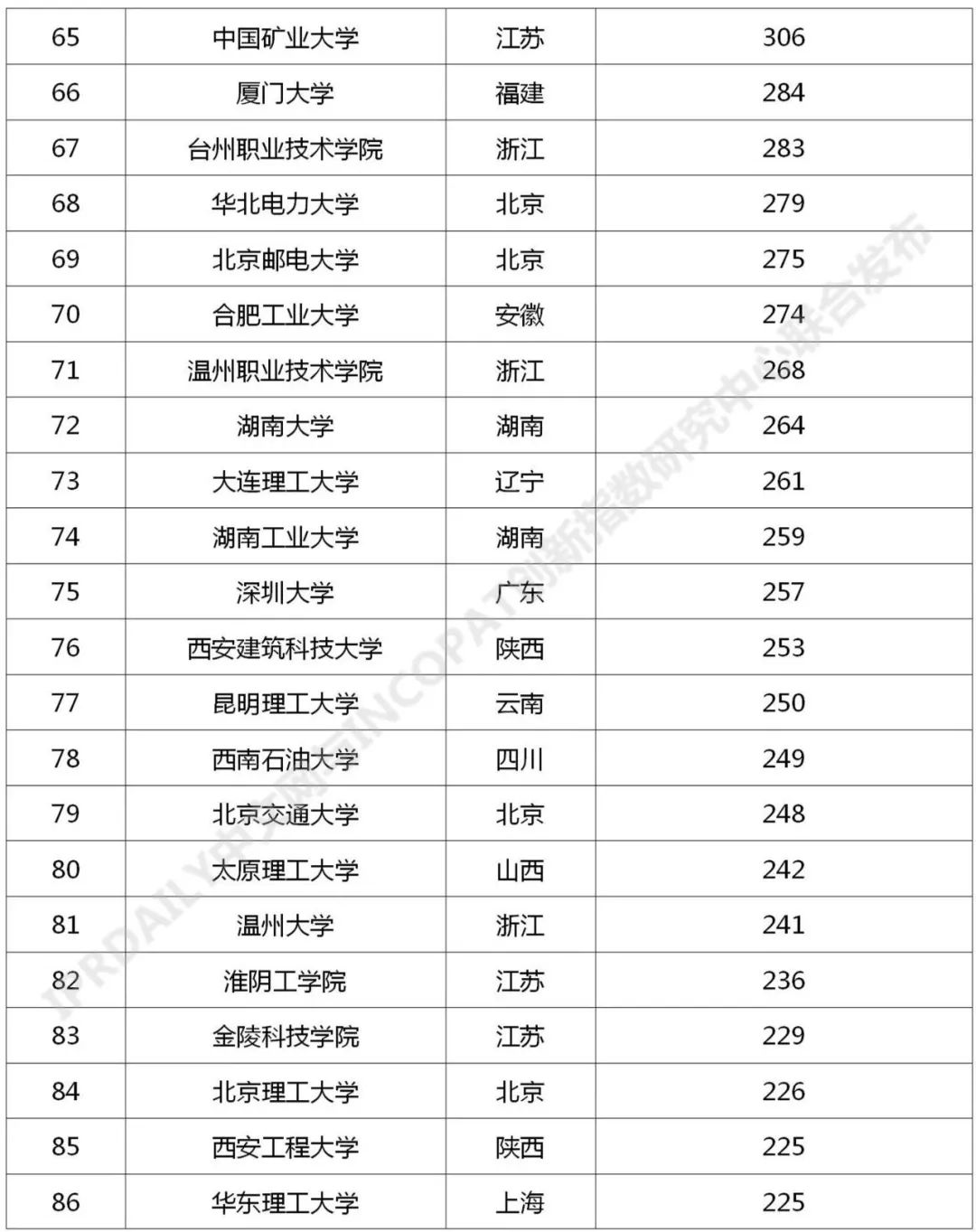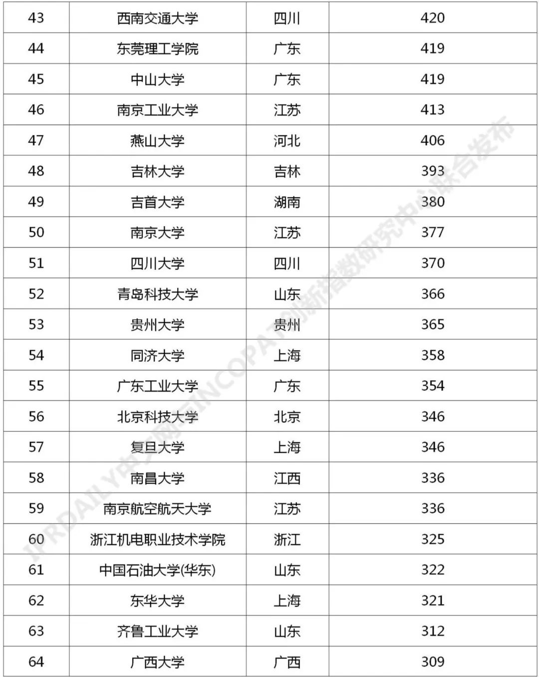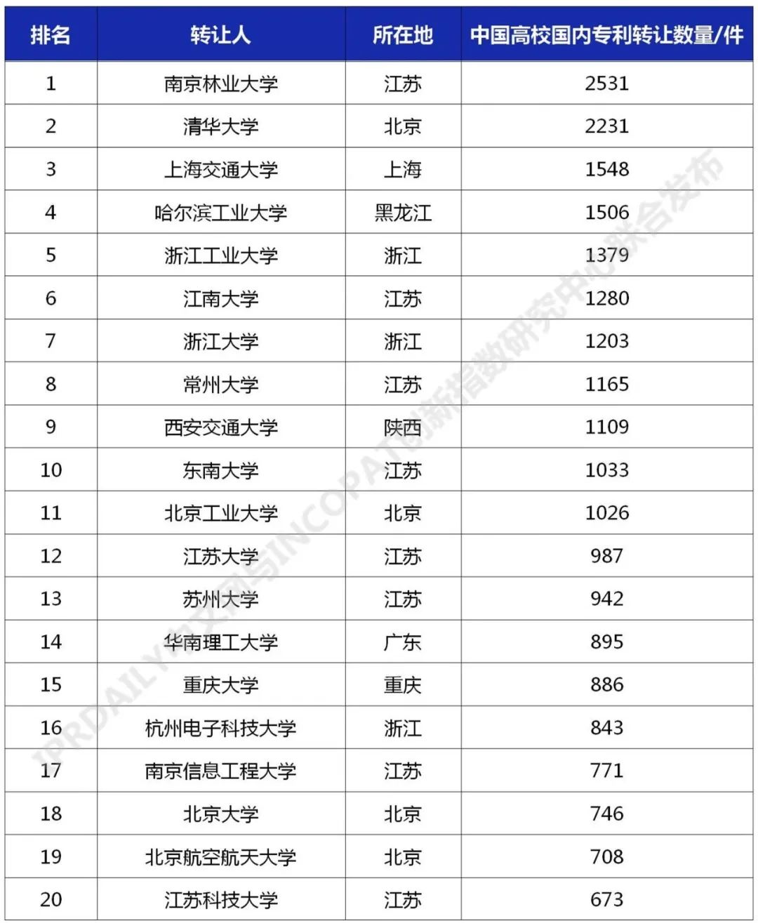 来源:IPRdaily中文网、incoPat创新指数研究中心 导读:近日,知识产权产业媒体IPRdaily与incoPat创新指数研究中心联合发布“中国高校专利转让排行榜(TOP100)”,前100名中国高校主要分布在江苏、北京、浙江、陕西、湖北、上海、广东等24个省市,国内专利转让数量均在191件及以上。其中南京林业大学以2531件专利位列第一,清华大学以2231件专利排名第二,上海交通大学以1548件专利排名第三。 当前,我国正在加快构建以国内大循环为主体,国内国际双循环相互促进的新发展格局,技术作为关键的生产要素,专利作为技术的主要载体,畅通技术要素流转渠道,提高专利资源配置效率,对于促进形成“双循环”新发展格局具有重要意义。2021年3月,财政部办公厅、国家知识产权局办公室发布《关于实施专利转化专项计划 助力中小企业创新发展的通知》,决定实施专利转化专项计划,利用三年时间,实现专利转化运用的激励机制更加有效、供需对接更加顺畅、转化实施更加充分、工作体系更加完善,专利技术转移转化服务的便利性和可及性显著提高,高校院所创新资源惠及中小企业的渠道更加畅通,中小企业创新能力得到大幅度提升,有力支撑知识产权密集型产业创新发展。 在此,我们对截至2021年3月31日,中国高校在中华人民共和国国家知识产权局登记生效的专利申请权/专利权转让数量(不含港澳台)进行了统计分析,以供参考。 中国高校专利转让排行榜(TOP100) 对截至2021年3月31日,中国高校在中华人民共和国国家知识产权局登记生效的专利申请权/专利权转让数量(不含港澳台)进行统计排名,前100名中国高校主要分布在江苏、北京、浙江、陕西、湖北、上海、广东等24个省市,国内专利转让数量均在191件及以上。其中南京林业大学以2531件专利位列第一,清华大学以2231件专利排名第二,上海交通大学以1548件专利排名第三。 数据整理:IPRdaily 数据来源:incoPat 中国高校国内专利转让技术分布 统计截至2021年3月31日,中国高校在中华人民共和国国家知识产权局登记生效的专利申请权/专利权转让数量(不含港澳台),通过IPC国际分类号分析该部分专利发现其主要围绕G01(测量;测试)、A61(医学或兽医学;卫生学)、G06(计算;推算;计数)、H01(基本电气元件)、C07(有机化学〔2〕)、H04(电通信技术)、C12(生物化学;啤酒;烈性酒;果汁酒;醋;微生物学;酶学;突变或遗传工程)、C08(有机高分子化合物;其制备或化学加工;以其为基料的组合物)、B01(一般的物理或化学的方法或装置)、A01(农业;林业;畜牧业;狩猎;诱捕;捕鱼)等技术领域分布。 数据整理:IPRdaily 数据来源:incoPat 排行榜说明: 排行榜统计截至2021年3月31日,中国高校在中华人民共和国国家知识产权局登记生效的专利申请权/专利权转让数量,包括发明、实用新型及外观设计专利,不包括香港、澳门和台湾的专利数据;专利公开公告日截至2021年3月31日,专利转让执行日截至2021年3月31日,转让信息包括专利权的继承或转让,不包括专利权人的变更;转让人统计高校和与该高校相关的分校区、附属校区、研究院、研究所、直属附属医院为转让人的专利,未包含与该高校相关的上级机构、校办企业、校属企业、合作企业、非直属附属医院、教学医院为转让人的专利。排行榜出现部分高校的专利件数相同,未做并排合并,是依据检索结果依次排列。以上排行榜仅为趋势参考。 |