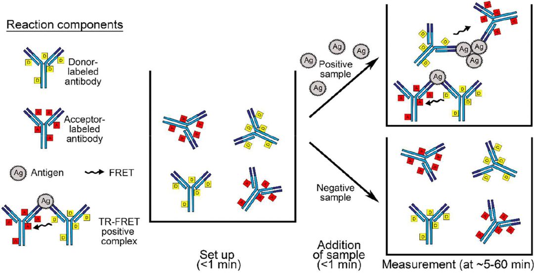 如果没有清洗步骤,检测过程要缩短一大半时间。但是清洗可以提高特异性,消除Hook效应。真是让人又爱又恨。即想要他的好,又不想他占用时间,最好召之即来,挥之即去。 行吗?有吗?可以吗?来,看一看 No Wash的免疫检测! 新闻 Finnish Researchers Leveraging Fluorescence to Develop Fast, High-Volume SARS-CoV-2 Antigen Test 芬兰研究人员利用荧光开发快速、高通量 SARS-CoV-2 抗原测试赫尔辛基大学的研究人员正在开发一项技术,可以使用一台计算机大小的仪器在一小时内测试多达 500 个样本。 该小组已经验证了这种抗原测试,该测试利用时间分辨荧光共振能量转移( time-resolved fluorescence resonance energy transfer, TR-FRET),涉及两个光敏分子或荧光团之间的能量转移。 当荧光团非常接近时,在相距约 1 到 5 纳米的时候,它们之间会发生能量转移 。荧光共振能量转移也称为福斯特共振能量转移。由此产生的 TR-FRET 信号变化可以通过测定进行测量。该测试系统使用紫外光进行荧光激发,并在时间延迟后测量发射信号,去除样品中生物物质的背景噪声。 赫尔辛基大学的 TR-FRET 检测使用供体和受体标记的多克隆兔抗体,这些抗体可以与 SARS-CoV-2 核蛋白和刺突蛋白结合。当样本呈阳性时,标记了供体荧光团的多克隆抗体会靠近标记了受体荧光团的多克隆抗体,两种版本的抗体都与样本中的 SARS-CoV-2 核蛋白或刺突蛋白结合。 灵敏度:97.4% (37/38) ,参照PCR 特异性:100% (10/10) ,参照PCR 如果可以开发出 SARS-CoV-2 商业测试并将其推向市场,则可以以 5,000 美元或更低的价格提供实验室仪器,“试剂成本将在每次反应 10 美分的范围内。” 原理 当供体和受体的荧光团接近时,荧光共振发生,受激供体将能量转移给受体,然后受体发出波长不同的光子。供体和受体越接近,能量转移越频繁,通常在15 ~ 60 Å的距离可达到50%的效率。 点评: 只要两个抗体靠的足够近,荧光共振能量传递就会发生,紫外光源激发供体,供体把能量传递给受体,受体发射荧光。 这个方法的一个关键点就是相距约 1 到 5 纳米,如果抗原比较大,然后抗原表位分得比较开,就不好用了。 标记镧系元素的说明 We labeled the affinity-purified antibodies, at 250 μg/reaction, with the donor (europium [Eu]) and acceptor (Alexa Fluor 647 [AF647]) using a QuickAllAssay Eu-chelated protein labeling kit (BN Products and Services Oy) and Alexa Fluor 647 NHS (N-hydroxysuccinimide) ester (Thermo Scientific) according to the manufacturer’s instructions. A disposable PD-10 desalting column with Sephadex G-25 resin (Cytiva) served to remove nonreacted fluorophores, and an Amicon Ultra 0.5-ml 50-kDa-NMWL centrifugal filter (Millipore/Merck) was used for concentrating the labeled antibodies, which were then stored aliquoted at −80°C until use. PDF论文:用于抗原检测的通用、可扩展和快速时间分辨 Förster 共振能量转移测定法——SARS-CoV-2 https://journals.asm.org/doi/full/10.1128/mBio.00902-21 |