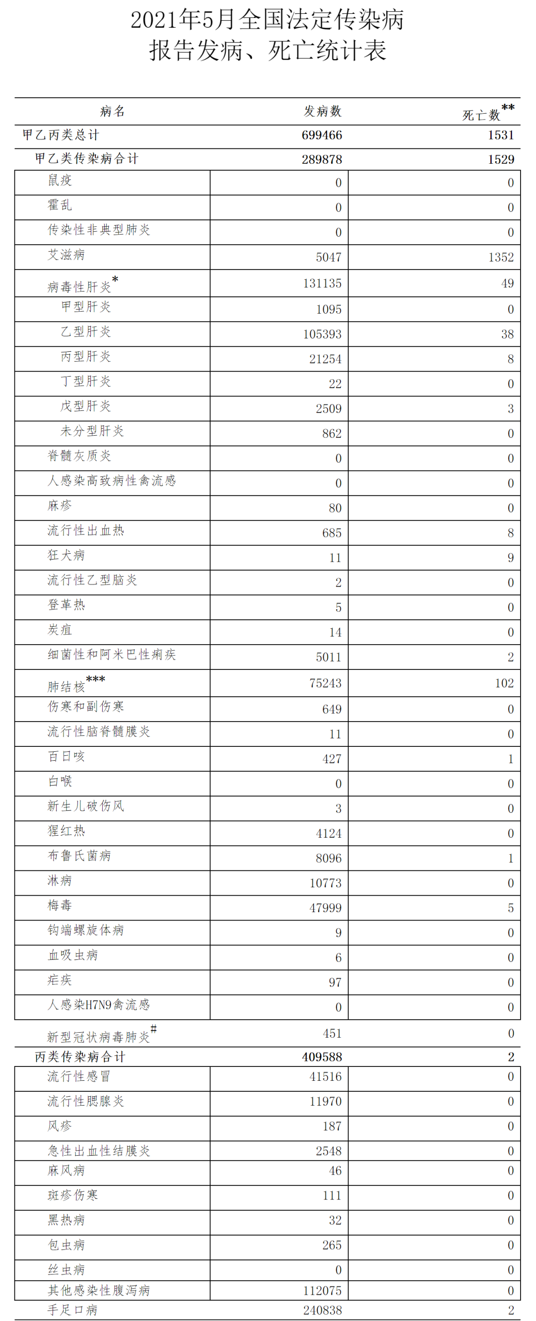 2021年5月(2021年5月1日0时至5月31日24时),全国(不含香港、澳门特别行政区和台湾地区,下同)共报告法定传染病699466例,死亡1531人。 其中,甲类传染病无发病死亡报告。乙类传染病中传染性非典型肺炎、脊髓灰质炎、人感染高致病性禽流感、白喉和人感染H7N9禽流感无发病、死亡报告,其余22种乙类传染病共报告发病289878例,报告死亡1529人。报告发病数居前5位的病种依次为病毒性肝炎、肺结核、梅毒、淋病以及布鲁氏菌病,占乙类传染病报告病例总数的94%。5月1日0时至5月31日24时,全国报告新型冠状病毒肺炎确诊病例451例,无死亡报告。 同期,丙类传染病中丝虫病无发病、死亡报告,其余10种丙类传染病共报告发病409588例,报告死亡2人。报告发病数居前3位的病种依次为手足口病、其他感染性腹泻病和流行性感冒,占丙类传染病报告病例总数的96%。 附件:2021年5月全国法定传染病报告发病、死亡统计表 注:发病数与死亡数按照终审日期进行统计;*:病毒性肝炎的发病数、死亡数为甲型肝炎、乙型肝炎、丙型肝炎、丁型肝炎、戊型肝炎、未分型肝炎报告发病数、死亡数的合计;**:通过传染病网络直报系统报告的死亡数据不作为中国传染病死因顺位依据;***:自2019年5月1日起“结核性胸膜炎”归入肺结核分类统计,不再报告到“其他法定管理以及重点监测传染病”中。#传染病网络直报系统监测报告数据。 |