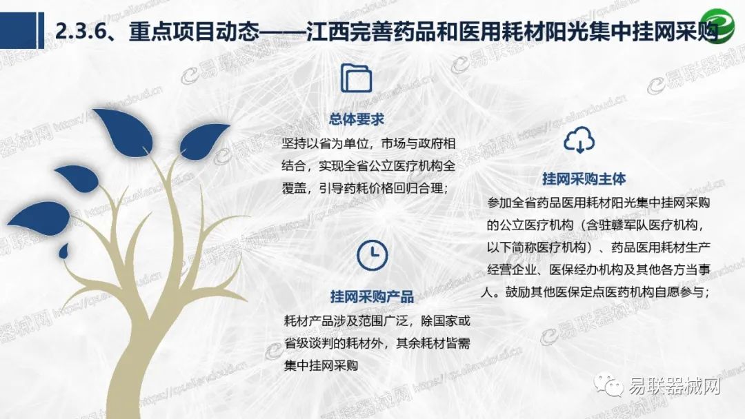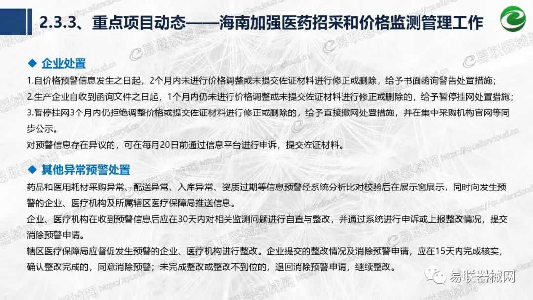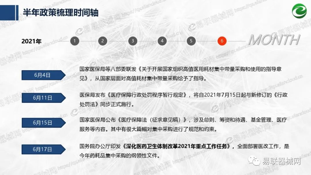 带量采购方面:2021年上半年,带量采购持续发力,仍是行业内的焦点所在。首批带量采购项目即将届满,相应续标工作有序展开;带量采购常态化、规范化文件相继出台,引领耗材带量采购走向新的篇章…… 常规项目方面:各地挂网工作有序开展,新老平台切换稳步推进;地方工作上:北京耗材限价挂网、内蒙古简化挂网流程、四川与江西规范并完善药耗集采工作、河南持续推进阳光挂网、海南实行“红黄绿”价格预警…… 政策方面:八部委联合印发带量采购规范文件,指导高值医用耗材集中带量采购;信用评价制度建立,严厉打击医疗行业不正当利益关系;医疗服务价格改革试点方案发布,建立合理补偿机制,稳定调价预期;医疗器械唯一标识第二批实施工作即将开展;《医疗器械监督管理条例》修订发布,旨在保障医疗器械安全、推动行业健康发展…… |
