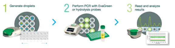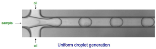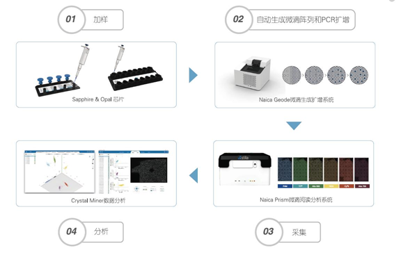 第一,加样和生成微滴:将样本和PCR反应液加入微流控芯片,放入仪器中,仪器可通过物理方法生成单层平铺的20000~30000个微滴阵列。 第二,对每个微滴进行PCR扩增:在Naica Geode微滴生成扩增系统自动进行PCR扩增。 第三,读取和分析结果:将芯片置于Prism微滴读取分析系统上进行荧光信号采集,计数阴阳性微滴,通过泊松分布计算获得靶标基因绝对拷贝数浓度。