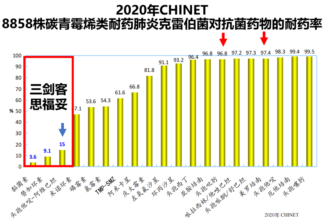 非常高兴与大家一起探讨关于耐药菌的治疗。大家知道细菌感染属于一个永恒三角,这个「三角」解决起来有点难。 最近世界卫生组织(WHO)联合世界动物卫生组织,以及联合国粮农组织,联手将抗菌药物统一命名为抗微生物药物(Antimicrobials),就是希望大家能合理地应用。但实际上如果真的要应用起来,其中的差别会很大。打个比喻:有人看到一幅落霞的美景,水面上有无数飞鸟,有水平的人也许会立刻吟诗「落霞与孤鹜齐飞,秋水共长天一色」,而到达不了那个水平的人看到这样的景色,只会大呼一声「这么多鸟!真好看!」这个比喻的意义是,每个人的临床思维,都会根据各人的眼界不同而有所不同,高水平与低水平之间差别巨大,这是由于抗菌药物的合理应用涉及很多方面,但我们最不希望是没有临床思路而只有临床「套路」。 碳青霉烯类抗菌药「倒下」后,能指望的是替加环素、多黏菌素、思福妥「三剑客」……但中国革兰阴性菌感染时「三剑客」也会遇到难以解决的困境 我们知道碳青霉烯类抗菌药是大家都认可的、到目前为止治疗严重感染最重要作用的药物。其结构特殊,与青霉素类的青霉环相似,但噻唑环上的硫原子为碳所替代,6位羟乙基侧链为反式构象,正是这个构型特殊的基团具有超广谱的、极强的抗菌活性,对β-内酰胺酶高度的稳定性以及毒性低等特点;其抗菌谱广:包括革兰阳性菌、阴性菌、需氧菌、厌氧菌均有很强的抗菌活性:公认为目前上市抗菌药物中的最强者;适应证宽:在多重耐药菌感染、需氧菌与厌氧菌混合感染、重症感染及免疫缺陷患者感染中发挥着重要作用。 可是大家知道碳青霉烯类抗菌药物是如何分类的吗?其实过去只有一类(即第二类),包括亚胺培南、美罗培南、帕尼培南、比阿培南、多利培南。后来出现了厄他培南,后者对非发酵菌无效,因此把它们分成了两大类(厄他培南为第一类)。但是所有这些碳青霉烯类再强也不能治疗MRSA,因此希望出第三类,能够同时治疗MRSA的碳青霉烯类抗菌药物。 看看现状:我们有前6种抗菌药物(中国没有引进多利培南),大家好像认为没有能够治疗MRSA的,但接着看,有了托莫培南和阿祖培南,这是能够治疗MRSA的碳青霉烯类。又有人说,碳青霉烯类只有静脉、没有口服的。有了,替吡培南,可以口服。又有人说,这些都是国外的,有我们自己国产的吗?也有了,百纳培南、艾帕培南。因此,碳青霉烯类抗菌药物在不断的发展当中。 这是2017年2月WHO首次发布12种致命耐药细菌清单。其中,被列为1类重点(极为严重)的就是碳青霉烯类耐药的鲍曼不动杆菌(CRAB),碳青霉烯类耐药的铜绿假单胞菌(CRPA),以及碳青霉烯类耐药的、产超广谱β-内酰胺酶(ESBL)的肠杆菌目(CRE)。我们叫它CRO。其中最难对付的就是CRE。 为什么CRE最难对付?因为CRE的问题在全球广泛存在,新定义纳入人群更广泛。 CRE的最新定义是什么?肠杆菌目细菌满足以下任一条件即为CRE:① 对任一碳青霉烯类抗菌药物耐药,亚胺培南、美罗培南或多立培南的最低抑菌浓度(MIC)≥4mg/L,或厄他培南MIC≥2mg/L;② 产生碳青霉烯酶;③ 对于天然对亚胺培南非敏感细菌(如摩根摩根菌、变形杆菌属、普罗威登菌属),需参考除亚胺培南外的其他碳青霉烯类抗菌药物的MIC。 上图可以看到鲍曼不动杆菌、铜绿假单胞菌、肺炎克雷伯菌对亚胺培南和美罗培南耐药的变迁(CHINET 2005-2020)。15年来,碳青霉烯类的使用量不断上爬,与耐药菌的分离率上升密切相关,近年来在严管管理之下,好不容易看到CRO的分离率终于有一点点下降。 针对77株CRE药敏结果数据显示:CRE对临床常用抗菌药物的敏感率均较低。问题在于碳青霉烯类耐药还有药用吗?放眼一看这个柱状图,全是「树桩子」。当然还4棵「树」,但实际只有两个药,多黏菌素和替加环素。四环素类治疗CRE,目前尚无理想的抗菌药物。因此我们应该思考,临床中针对CRE感染,应如何选择适当的抗菌治疗方案?碳青霉烯类抗菌药「倒下去」以后我们还能指望谁?一定是「三剑客」:替加环素、多黏菌素、思福妥。 看XDR、PDR肠杆菌目细菌的抗菌治疗,有多黏菌素(国内品种众多)和替加环素(剂量不断增加),磷霉素的联合治疗(多黏、替加、碳青霉烯类、氨基糖苷类),(头孢他啶、头孢吡肟、亚胺培南)+克拉维酸(对KPC有一定的抑制作用)?以及氨曲南+阿米卡星?(产金属酶包括NDM-1部分菌株仍对此2药敏感),头孢他啶/阿维巴坦(应用经验不足)。因此结论是:治疗CRE尚无理想的抗菌药物。 除了多黏菌素、替加环素,就是新出来的思福妥。这「三剑客」真能满足我们的要求吗?从抗菌谱分布图我们可以一目了然地看到,这「三剑客」的抗菌谱和抗菌活性各有不同。面对碳青霉烯类耐药,临床可选择的治疗药物非常有限。 而抗菌谱最宽的还是多黏菌素。再看看其他药物的缺点,替加环素的问题是剂量不足。即使是首剂200mg,然后100mg/q12h维持都觉得不够,国际上已经有用到150mg/q12h甚至用到200mg/q12,这真的管用吗?真不一定,但不良反应的增加却是一定的。 大家知道现在欧洲已经把替加环素的折点降到了0.5mg/L,如果我国也以0.5mg/L为折点的话,则耐药更为严重了。那就指望多黏菌素?但多黏菌素又有一个异质性耐药问题,它可以导至治疗失败,剂量计算起来又复杂,大家还担心它的肾毒性,所以它也有一定的局限性。 针对病原菌CRE、铜绿假单胞菌、鲍曼不动杆菌等,如何推
