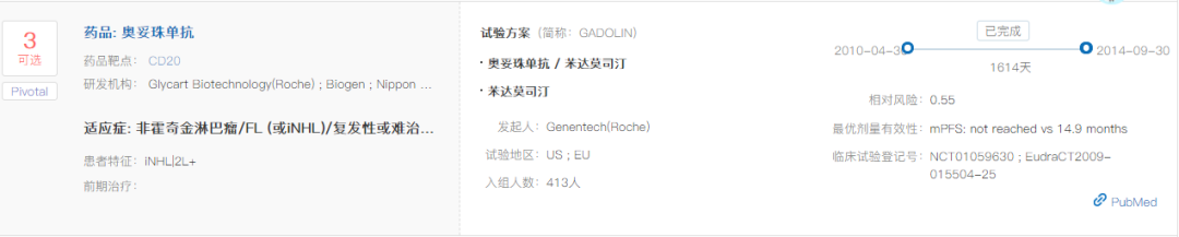 此外,在二线及以上治疗利妥昔单抗难治性惰性非霍奇金淋巴瘤的III期临床试验GADOLIN(NCT01059630)中,奥妥珠单抗联合苯达莫司汀序贯奥妥珠单抗维持治疗的疗效优于苯达莫司汀单药治疗,中位PFS分别为未达到和14.9个月(HR=0.55;95% CI: 0.40-0.74; p=0·0001)。