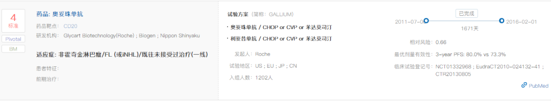 在一线治疗滤泡性淋巴瘤(FL)的全球III期临床试验GALLIUM(NCT01332968)中,奥妥珠单抗联合化疗对比利妥昔单抗联合化疗,无进展生存期显著延长(3年PFS率为80.0% vs. 73.3%,HR=0.66;95% CI: 0.51-0.85;p=0.0012),达到主要研究终点。