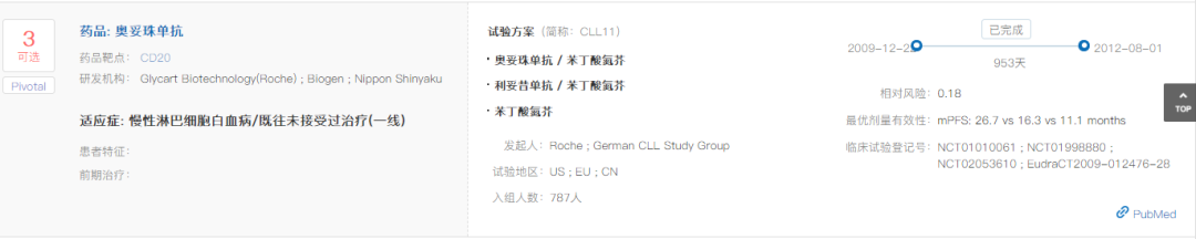 在一线治疗慢性淋巴细胞白血病(CLL)的全球III期临床试验(NCT01010061)中,奥妥珠单抗+苯丁酸氮芥vs. 利妥昔单抗+苯丁酸氮芥vs. 苯丁酸氮芥的mPFS分别达到26.7 vs. 16.3 vs. 11.1个月。与苯丁酸氮芥单药相比,奥妥珠单抗+苯丁酸氮芥降低疾病进展或死亡风险达82%(HR=0.18;95% CI: 0.13-0.24; P<0.001)。