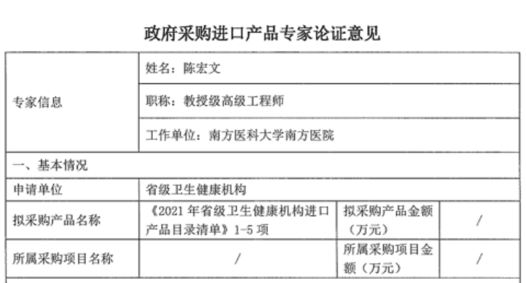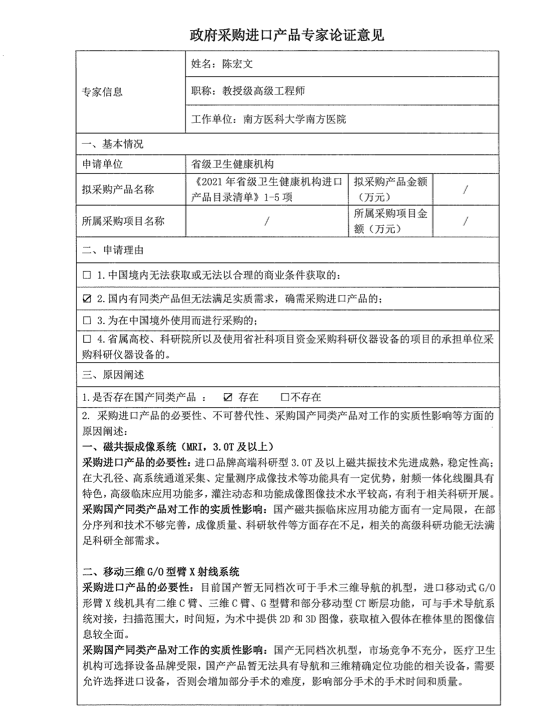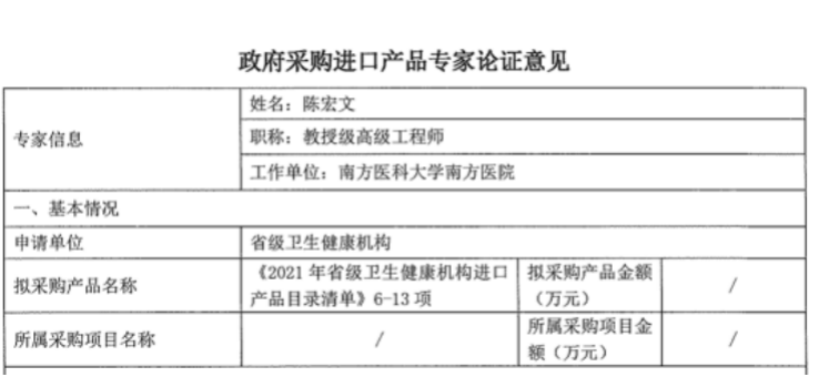 而广东省公布的《政府采购进口产品专家论证意见》中,可以发现,不仅论证过程清晰,而且相关的设备还对应到具体的专家,且结果表述更详细专业,如陈宏文论证核磁共振成像系统,移动三维G/O型臂X射线系统等。