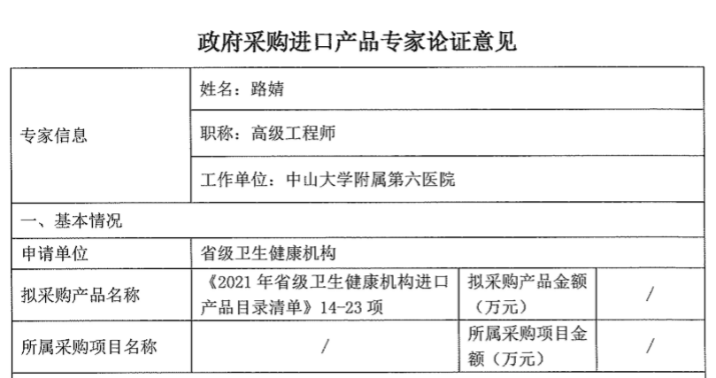 同时,从广东省的这份意见中还可以看到,除了律师需对所有拟进口产品判定是否属于国家限制进口产品外,其他的专家都是依托个人专业经验进行了分组,各自对其对应的拟进口产品进行评估。比如前面提到的陈宏文专家就同几位专家负责了清单的1-13项产品的评估,中山大学附属第六医院高级工程师路婧等几位专家则负责了14-23项的产品评估。这种评估方法显然更加科学合理,毕竟术业有专攻,即便都是专家,对于不同领域的医疗设备了解还是不一样的。