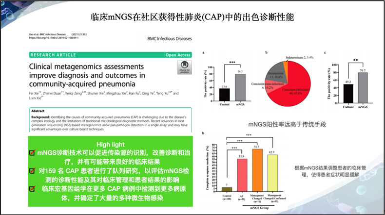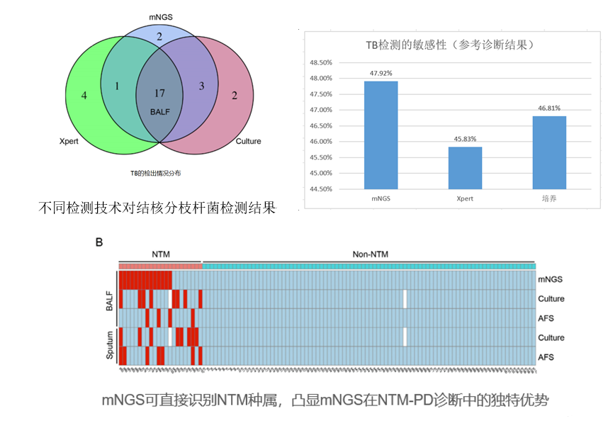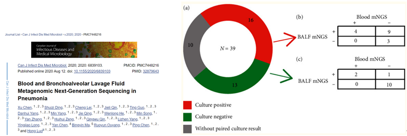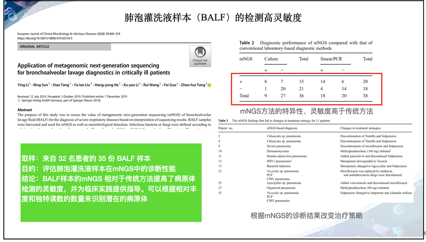2、呼吸系统感染篇 2.1 肺泡灌洗液(bronchoalveolar lavage fluid,BALF)凸显mNGS多种临床价值 广泛病原体检测 mNGS的应用价值也在大量的BALF应用中得到了验证。解立新教授等(Xie et al., 2021)发现mNGS的阳性率远高于传统技术,且与血液样本相比,BALF 通常更有可能提供更好的病原体检测,而根据mNGS结果调整患者的临床管理,患者病情得到明显地缓解。 Shi 等人(Shi et al., 2020)的研究结果显示mNGS诊断肺结核的灵敏度与传统方法没有显著差异,但是对非结核分支杆菌和其他病原体的灵敏度显著高于传统微生物检测。 2.2 不同的呼吸道样本类型,mNGS检测性能差异较大 BALF vs 血液 2020年,Chen等人在肺部感染患者中比较了39例患者的BALF与血液样本mNGS检测结果,其中BALF mNGS敏感性为81.3%(13/16),而血样本mNGS敏感性为25.0% (4/16),二者检测敏感性具有显著差异(p=0.003),但二者在检测特异性无显著差异(76.9% vs84.6%,p=0.317)。BALF mNGS 在检测细菌和真菌方面比血液 mNGS 更敏感,这也提示了从诊断性能上说,血液可能不是呼吸道感染的最佳样本。