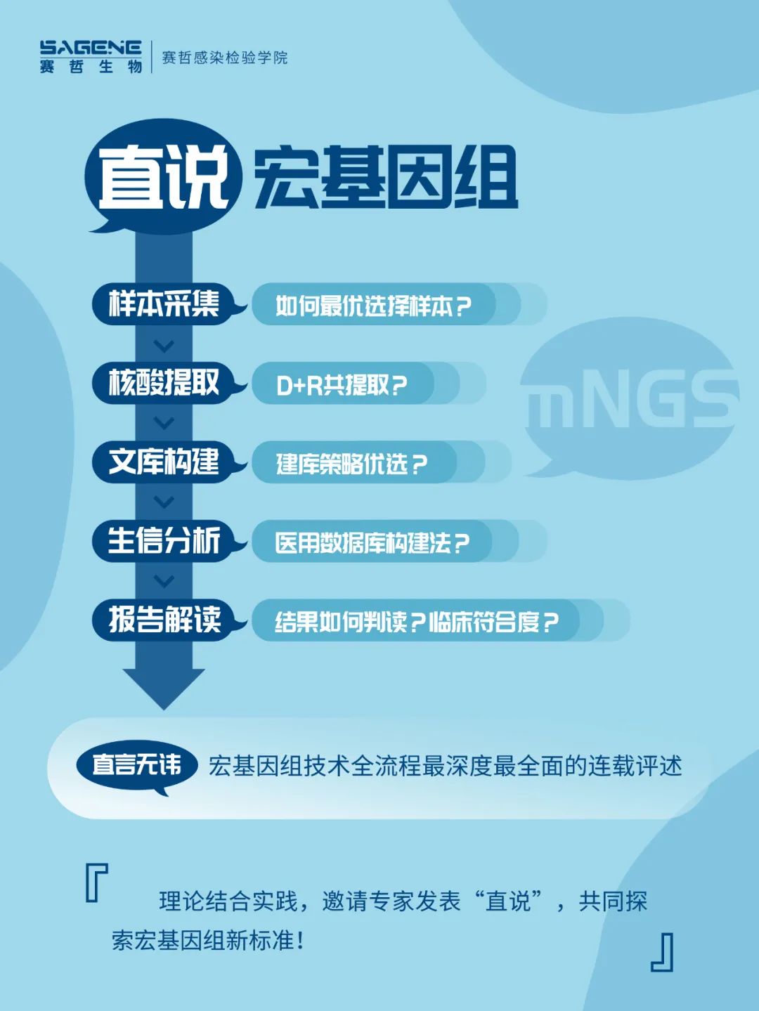 ——从样本角度观宏基因组应用 1、宏基因组二代测序应用简述 2014年加州大学旧金山分校的医学实验室报告首例宏基因组二代测序(metagenomic next generation sequencing,mNGS)检出钩端螺旋体以确诊脑膜炎病例后,mNGS作为一项新型的分子诊断技术逐渐走进临床视野。由于mNGS具有无需培养、检测速度快、无偏向性等技术优势,得到了越来越多病原学专家的认可与推荐。 mNGS检测,始于样本,样本类型与质量好坏对于后续结果的影响不言而喻。