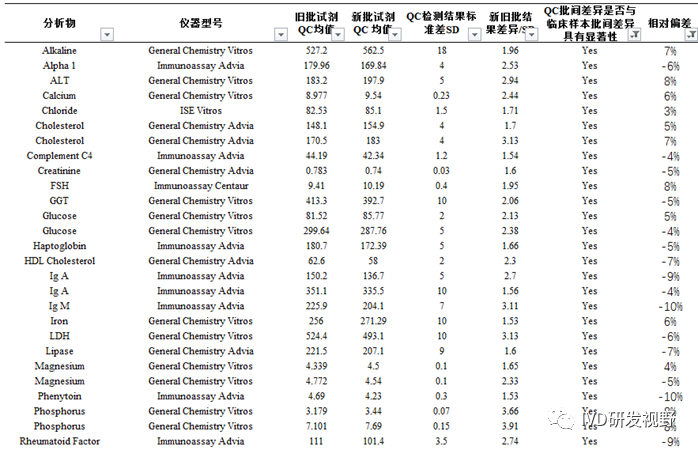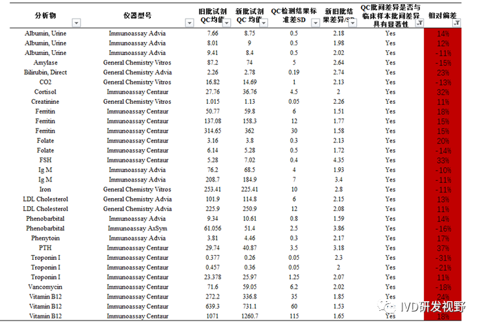 方法:获得试剂批更换验证时检测质控物和临床样本的结果,这些结果来自18种质控物、661个不同试剂批,1483个次质控物检测,82种分析物,7种仪器。通过双样本异方差t检验分析更换试剂批检测质控物的批间差异和更换试剂批检测临床样本的批间差异是否具有显著性。 结果:总体上,40.9%的质控物批间差异与临床样本批间差异具有显著性。当质控物批间差异小于1SD(83.1%)时,37.7%的质控物批间差异与临床样本批间差异具有显著性。当质控物批间差异大于1SD(16.9)时,57.0%的质控物批间差异与临床样本批间差异具有显著性。 结论:不同批试剂检测质控物结果显示不具有互通性的比例较高40.9%,质控物不应该用于评价试剂批更换前后检测临床样本的一致性。 文章的内容主要是对上述方法和结果的详细分析,立场类似临床检验中心监管机构,旨在强调和要求使用质控物的客户和能力验证组织者要对该差异引起重视。否则会对新批次试剂是否可应用造成错误判断,或是对能力验证结果未进行试剂批次分组统计而对验证结果做出错误判断。 3.统计分析案例 以LDL胆固醇测试结果分析为例。数据包括旧批次试剂测试质控品的10个结果、新批次试剂测试质控品的10个结果以及新旧批次测试7个临床样本的结果。通过分析这些数据,确定质控结果的批间差异是否和临床样本批间差异具有统计学意义。计算以标准差(SDI)为单位时质控结果的批间差异大小。 4.新旧试剂批检测质控物的差异 通过质控数据,了解不同方法学原理、项目、厂家的试剂产品批间差异。 ③质控批间差异在±10%以内,但是不代表临床样本批间差异在±10%以内。 ④质控批间差异在±10%以内,同时代表临床样本批间差异在±10%以内。 |