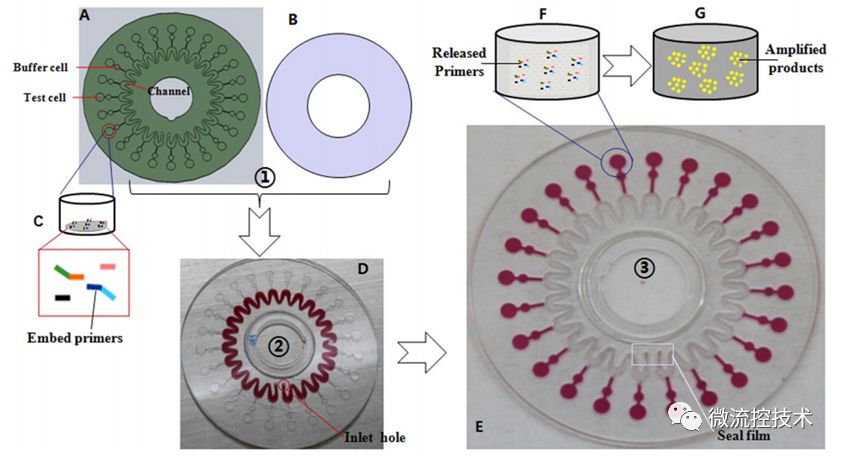 Abkar Ahmed Sayad 等开发出一种碟式离心型微流控装置。该装置分为三层,底部PMMA层,中间压敏胶(PSA)粘合层和底部PMMA层。微流控通道通过切刻机在底层制作出混合试剂、测量、 等温扩增和检测的微流控腔室。LAMP 实验的排气和装载孔、蜡、密封材料放在微流控 CD 顶层。该系统,对添加沙门氏菌的番茄进行检测,检出限为 5×10-3 ng/uL。整个过程,从样品制备到检测,可以70min内在微流控 CD 上全自动化完成。
