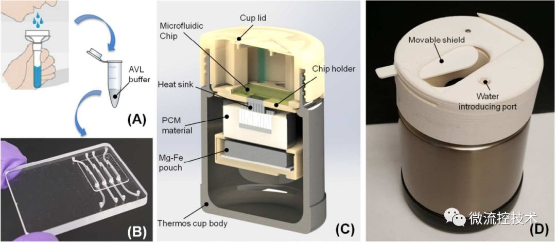 Song等研制了一种简单易于操作,价格低廉,POCT集成式,RT-LAMP微流控芯片装置,可用于寨卡病毒检测。该装置在杯盖抽屉内集成了镁-铁反应的热源,来控制LAMP反应温度。一次性微流控芯片完成病毒核酸的捕获、浓缩、提纯、等温扩增和检测。扩增产物的检测不需要额外的仪器,采用无色结晶紫染料进行目测。整个装置可以在40min内完成口腔样本中寨卡病毒灵敏度5个单位。