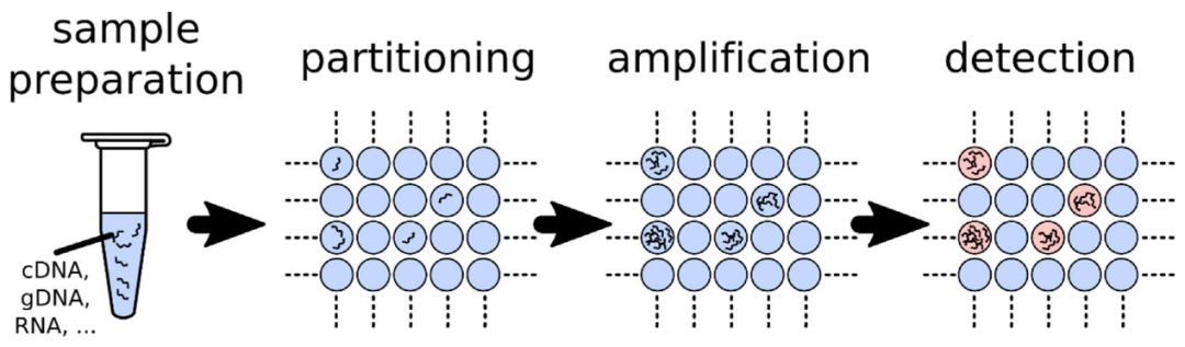导 航 ☞ PCR技术发展简史 ☞ 数字PCR技术简述 ☞ 数字PCR性能表现评估简析 PCR技术发展简史 PCR(聚合酶链式反应,Polymerase Chain Reaction)技术起源于20世纪70、80年代。在过去的 100 年里,PCR技术的发明给生命科学带来巨大的改变,成为生物学和遗传学研究史上的里程碑事件[1]。 经过几十年的发展,经历了第一代的终点法PCR、第二代荧光定量PCR和第三代数字PCR的演变,PCR技术的应用从早期的生命科学研究迅速扩展到医疗筛查诊断、遗传学分析、法医分析鉴定及食品卫生和环境检测等方面。(图1) 图1 PCR技术发展历程(图片来源:dPCR: A Technology Review. Sensors (Basel). 2018 Apr 20;18(4):1271.) 数字PCR技术简述 20世纪末,Vogelstein等提出数字PCR( digital PCR,dPCR) 的概念:通过将一个样本充分稀释,分配到不同的反应单元,每个单元包含少于或等于一个拷贝的目标分子( DNA模板) ,在每个反应单元中对目标分子进行单独、平行的PCR扩增,扩增结束后对各个反应单元的荧光信号进行统计学分析,以实现绝对定量及稀有等位基因的检测[2](图2)。 与第一、二代PCR技术相比, 数字PCR具有很多优势[3]: 1. 特异性、灵敏性均有显著提高; 2. 在不依赖内参和标准曲线的前提下,可直接得到绝对量化指标; 3. 微反应单元相互独立、封闭,避免了PCR抑制剂及不同核酸分子扩增产物间的相互干扰,极大的提高了检测的准确度和可重复性。 图2 数字PCR示意图(图片来源:dPCR: A Technology Review. Sensors (Basel). 2018 Apr 20;18(4):1271.) 数字PCR性能表现评估简析 |