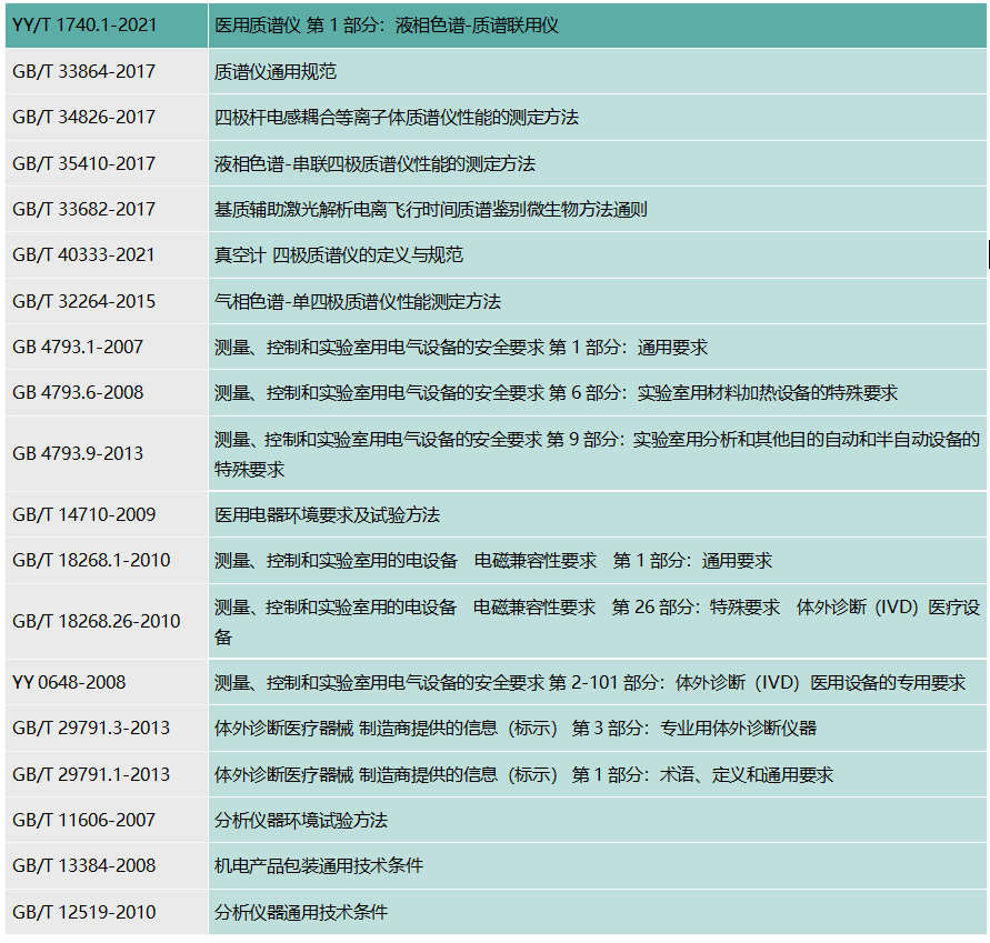目前,国家药监局已发布液相色谱-质谱联用仪的专标,即《YY/T 1740.1-2021 医用质谱仪 第1部分:液相色谱-质谱联用仪》。YY/T 1740.1-2021的前言中也透露出YY/T 1740 医用质谱仪系列中即将出台的其他标准,分别是“第2部分:基质辅助激光解析电离飞行时间质谱仪”“第3部分 气相色谱-质谱联用仪”“第4部分:无机质谱仪”,非常值得期待!