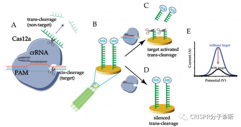 CRISPR诊断被称为下一代分子诊断技术,美国FDA和中国NMPA都颁发过CRISPR诊断平台的新冠诊断EUA授权,而前几天上海伯杰医疗“恒温CRISPR法新冠快检试剂盒”获批的消息无疑进一步激发了大家对CRISPR诊断的热情。CRISPR诊断主要包含样本前处理(含预扩增)、靶标识别、信号释放和检测几部分。本文将主要介绍CRISPR诊断方法所采用的信号报告系统,主要是荧光淬灭、侧向层析和电化学三种方法(相关的内容,James Collins和张锋团队于今年7月发表于Nature Biomedical Engineering的综述文章中有过简单介绍1)。 CRISPR技术被用于分子诊断主要因为特异性:在向导RNA的引导下,CRISPR-Cas蛋白识别靶标序列的特异性极佳,甚至可以精确区分单碱基差异。另外,Cas蛋白接触靶标序列后会被激活出无差别的反式切割活性,无差别的一阵刀光剑影,将周围一切可切割的核酸序列高效切割,从而起到放大信号的作用。同时具备特异性识别和无差别切割特征的CRISPR诊断系统简直就是一把装着瞄准器的霰弹枪。 图1. Cas蛋白识别和切割靶标序列的示意图。图片摘自猛犸生物的官方网站。Cas蛋白通过向导RNA特异性识别并结合靶标序列(对于dsDNA靶标,则需要PAM序列),形成三元复合物,在顺式切割靶标序列的同时也激发出反式切割活性,将周围的核酸序列进行无差别的切割。目前,鉴定的有顺式和反式切割活性的Cas蛋白主要集中在Cas12和Cas13两类蛋白,分别识别(/切割)DNA序列和RNA序列。 由于Cas蛋白只有在特异地识别和结合靶标序列后才切割周围的核酸序列,因此通过检测报告序列是否被切割就可以判定待检体系中是否存在靶标序列。几乎所有的CRISPR诊断方法都通过向体系中加入某些可被检测的外源探针来完成诊断的流程。首次利用CRISPR进行靶标核酸检测的时间应该可以追溯到2016年,Jennifer团队在Nature上发表了Cas13a反式切割活性鉴定的工作,并首次利用Cas13a反式切割活性来切碎荧光淬灭探针,使得探针不被淬灭并发光,从而完成了对靶标RNA的检测2。到了2017年,张锋团队和James Collins团队合作开发了SHERLOCK诊断方法,也是利用了Cas13的反式切割活性3:通过在体系中加入外源的单链报告探针,探针两端分别标记荧光基团和淬灭基团修饰。当探针被Cas蛋白切断,淬灭基团和荧光基团分离导至荧光淬灭失效,荧光基团恢复活性。相比于Jennifer的工作,SHERLOCK引入了靶标扩增的环节,从而将检测灵敏度提高到了aM级别,使得CRISPR诊断真正具备了实用价值。图2. CRISPR诊断荧光淬灭法的信号示意图。图片摘自SHERLOCK系统3在此之后,几乎所有CRISPR分子诊断方法都在检测体系中加入了外源报告探针,并逐渐形成了不同的信号检测系统。其中,荧光淬灭法是一种技术成熟且已经被广泛用作分子诊断的信号报告系统,用于CRISPR诊断时不需要任何新的设计,几乎算是无缝衔接。然而在应用上,荧光淬灭属于液相体系,如果想在同一管内做多重检测的话还是比较费劲的,也需要多色荧光设备,所以今年Jennifer团队开发的免扩增检测新冠的FINTD-IT系统就采用的是双管法,每管还是只检测一个靶标4。电化学传感器法也能和CRISPR诊断系统进行无缝衔接,最直接的方式是用探针将电化学活性物质偶联到电极上,产生较强的电信号响应。由于探针被切割后会使活性物质脱离电极,信号响应降低,故可以通过信号响应的变化来进行诊断。图3. 基于CRISPR和电化学原理的E-CRISPR系统5。 还有一种思路是对偶联到电极的探针本身在切割前后在电极上的固化量差异进行检测,比如在切割反应结束后,通过银增强的方法将银离子固化到探针表面来增强电极信号。探针被切割后信号会减弱,通过这个方式来确定探针是否被切割7。总之,基于CRISPR的电化学的方法有非常多的系统,有兴趣的话,可以阅读之前的文章(CRISPR电化学文章之1,2,3,4,5,6,7)。当大家都在荧光淬灭的路上狂奔时,张峰团队推出了SHERLOCKv2,引入核酸试纸条作为信号报告系统,非常便于POCT使用8。他们在探针的两端分别引入两个小分子标记物FAM和生物素。而他们使用的商品化核酸试纸条将抗FAM抗体用胶体金标记,NC膜上检测线处包被有可结合生物素的链霉亲和素,这种试纸条的原本用途是通过夹心法检测同时含有FAM和生物素的核酸扩增产物。张锋团队则开创性地改变了试纸条本身的判读方式,将这种夹心法试纸条的质控线作为检测线来检测探针是否被切割。他们调整探针浓度,保证在探针未被切割时,所有胶体金都集中在下面那条线,而一旦探针被切割,就会有胶体金越过下面的线到达上面的线显色。 图4. 侧向流层析试纸条工作原理。图片摘自Milenia公司官网。该试纸条开发的最初用途是检测同时含有FAM和Biotin的产品(如上图),在张锋开发出其CRISPR用途后,Milenia公司也在官网展示了其CRISPR诊断方向的用途。图5. CRISPR诊断侧向层析法的工作原理。图片摘自SHERLOCKv2系统8 将这种夹心法的试纸条通过竞争法方式进行判读的设计,非常巧妙。好处在于摆脱对仪器的依赖,可以更好地走向POCT。前段时间James Collins团队开发的、火爆全网的、可以检测新冠的口罩系统,也是采用这种方式9。图6. CRISPR诊断侧向层析法的结果解读。图片摘自SHERLOCKv2系统9。如上图最右条检测条带所示,在检测阴性样本时,也会出现淡淡的T线,从而会给检测结果的判读带来困扰。 以上介绍的三类是基本的方法,此外还有很多调整或者混合使用的方