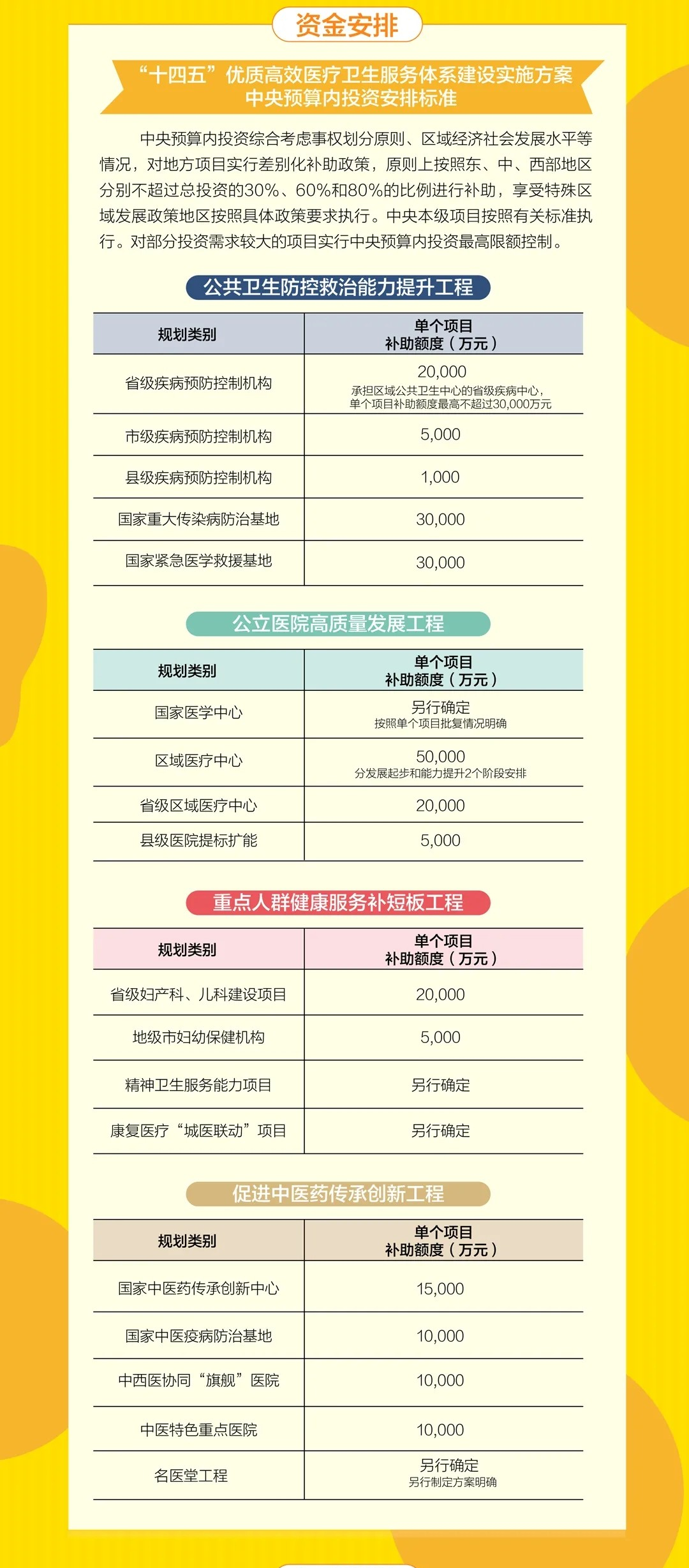 2021年,是疫情爆发的第二个年头,也是十四五规划的起始之年。未来15年,中国医院的新老基建热潮将就此掀起! 下个15年,财政重点砸向4大医疗工程 疫情的突然爆发,暴露出中国公卫共生体系的诸多不足,当前发热门诊覆盖率低、传染病区建设不完善、人均ICU床位不足等成为医院设施的严重短板。 近日,国家发改委在内的四部委联合发布《“十四五”优质高效医疗卫生服务体系建设实施方案》(以下简称《方案》)。 这份攸关中国医疗未来15年发展方向的重要文件,掀开了中国医疗”新老基建热潮“的大幕。《方案》明确要从4大工程,14大方向,全面推进中国医疗重大工程建设,并且中央财政规划了具体资金投放。 省级文件下发!超百亿砸向这些医院建设 在国家下发之后,各省相继出台省级十四五医疗规划文件,这意味着,以公共卫生防治能力提升、高质量公立医院建设等四大工程为重点方向的”基建热潮“,要全面落地执行! 福建省政府下发了《福建省“十四五”卫生健康发展专项规划的通知》(以下简称《规划》)。福建省这份15年规划,可谓是高举高打,围绕国家方案制定了具体的落地计划。 《规划》中下发了《“十四五”期间省级医疗卫生机构重大基础设施建设项目表》,明确投入126.12亿元,用于全省13所大型医院建设,其中包括相关科室医疗设备配置。 全面加大发热门诊、疾控实验室,设备配置! 在公共卫生防控救治能力提升工程方面,《计划》要求全面加大发热门诊、疾控中心及实验室、传染病房等建设,配齐相关医疗设备配置: 提升县域急救中心、发热门诊建设! 全部配置这些医疗设备 《规划》要求到2025年,福建全省59个县(市、区)综合医院要全部建成“四大中心”,即卒中中心、胸痛中心、呼吸诊疗中心、创伤中心; 对于“四大中心”建设标准,近日《福建省县域医共体能力提升项目实施方案(2021-2025年)》下发,也明确规范了设备配置标准。 同时,加快基层医疗卫生机构发热诊室(或发热门诊)建设,全省 300 个以上基层医疗卫生机构利用现有业务用房进行平战结合改造,规范设置发热诊室(或发热 门诊),配置传染病防控有关设施设备,2022 年底完成建设任务。 也就是说,发热门诊医疗设备配置目录中的所有医疗设备,也必须要全部配齐。 附1:发热门诊医疗设备配置参考目录 重点专科、区域医疗中心建设!配置大批设备 除此之外,在重点专科建设方面,妇幼专科及医院方面: 康复医疗方面: 加强康复医院和综合医院康复医学科建设,重点支持设区市康复医院、县级综合医院康复医学科建设。推动康复医疗与康复辅助器具配置服务衔接融合。 在区域医疗中心建设方面: 后疫情时代的医疗信息化!财政全面加码 在国家版和福建省的医疗十四五规划中,都能清晰看到财政在全面加码医疗信息化建设。尤其是疾控信息系统和危急重症等临床重点专科的临床科研数据中心建设。 来自:医疗器械经销商联盟 · END · |