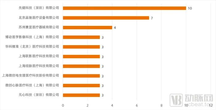 统计历年获批创新医疗器械数量排名前十位的企业,先健科技(深圳)有限公司表现突出,以10次获批遥遥领先,其创新医疗器械集中在心血管领域。
