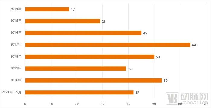 根据动脉网的统计,截至2021年9月23日,共有346款医疗器械进入了创新医疗器械审批程序。2017年曾有64款创新医疗器械进入审批程序,是迄今为止的巅峰。