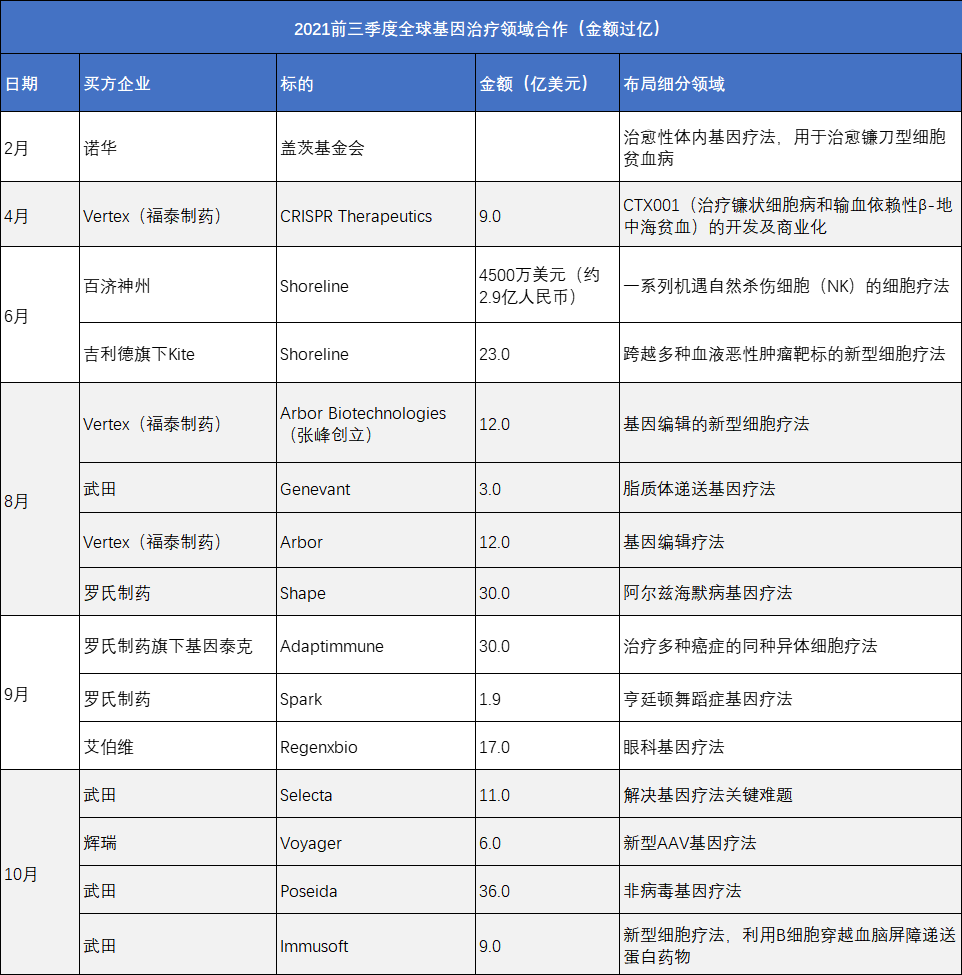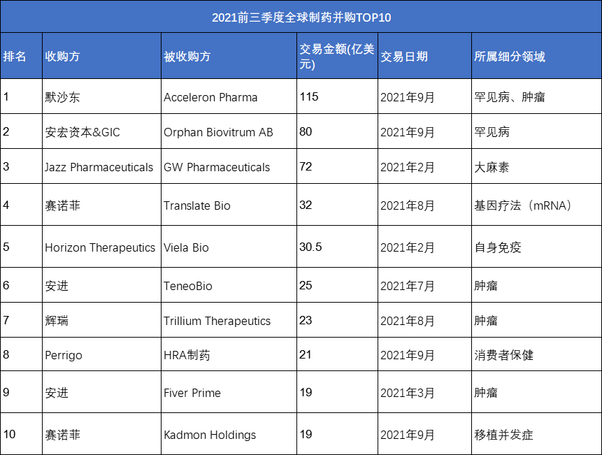 总体而言,目前投资者和银行家们都希望Q3大健康领域M&A的热闹局面能持续下去,并对此表示乐观。因为近几个月来,生物科技企业在股票市场上的低迷表现,有利于买家能获取更好的价格。 制药领域并购趋势:罕见病、基因疗法成下一热点 截止目前,2021制药领域并购标的前十,