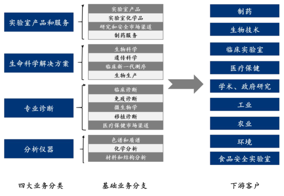 目前,赛默飞世尔的业务类型包括仪器(占比50%)、耗材(占比25%)、服务(占比25%)。 其具体四大业务为:实验室产品和服务(占比35%)、生命科学解决方案(占比35%)、专业诊断(占比15%)、分析仪器(占比15%)。 赛默飞世尔业务矩阵 其中实验室产品和服务业务就包含了制药服务,也就是CXO服务。并且从2017年开始,赛默飞世尔似乎开始加大了这一领域的力度。