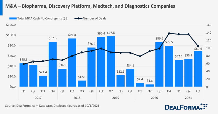 大健康并购领域,被疫情压抑热情和资金继续在2021得到释放,并在Q3到达一个小高潮,基本恢复到疫情前状态。 2017-2021全球大健康领域并购 2021前三季度大健康领域M&A交易金额已达1755亿美元,同比增长78%。其中,制药M&A交易金额523亿美元。