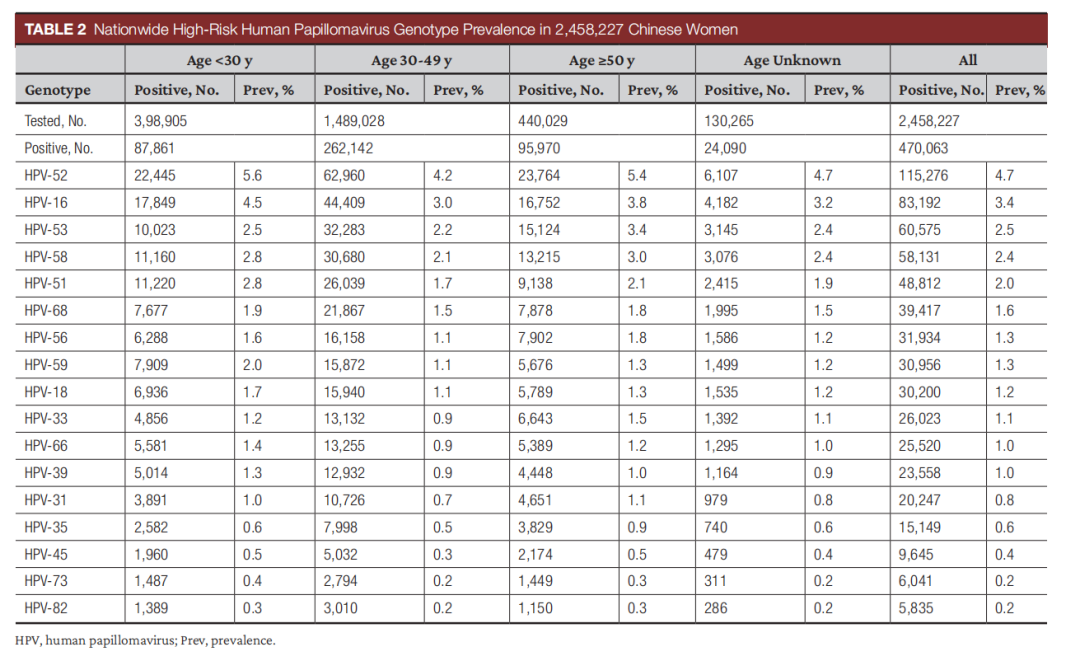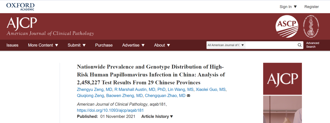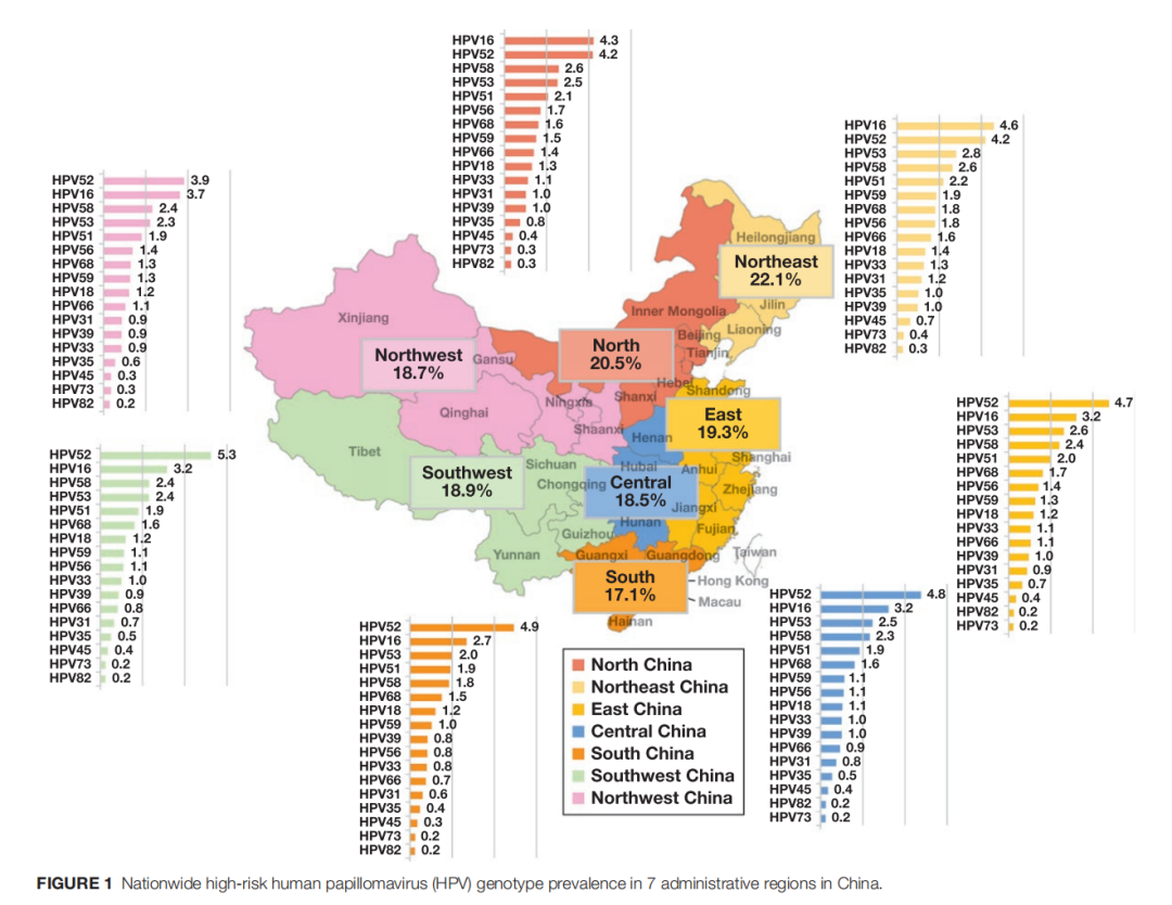 11月1日,《AJCP》(美国临床病理学杂志)线上发布了中国高危型人乳头瘤病毒(HPV)感染的流行状况及基因型分布的研究结果。该研究基于中国知名第三方医检机构金域医学近250万例HPV检测数据,经分析得出结论。其发现,在中国,最常见高危HPV基因型为HPV52,HPV16,HPV53,HPV58,HPV51。总体看,中国高危型HPV感染率为19.1%。文章作者表示,这是目前世界上最大的HPV基因分型数据回顾性研究,为衡量中国HPV疫苗接种和基于HPV的宫颈筛查的进一步影响提供了基线结果。 为了实现世界卫生组织提出的“加快消除宫颈癌”的目标,近些年,中国政府不断推进宫颈癌筛查,包括HPV基因分型在内的HPV分子检测等手段被广泛应用。HPV基因型特异性流行率的变化已被公认为是HPV疫苗接种和新的基于HPV的宫颈筛查技术筛查影响的潜在客观指标。 本回顾性研究分析了2018年7月至2019年6月以来,金域医学在全国29个省份的近250万例宫颈hrHPV基因分型检测的数据。这些数据主要来自当地的医疗机构和体检中心。研究发现,hrHPV阳性结果总患病率为19.1%,其中年龄小于30岁(22.0%)和50岁及以上(21.8%)女性hrHPV感染率最高的双峰。最常检出的hrHPV基因型为HPV-52(4.7%)、HPV-16(3.4%)、HPV-53(2.5%)、HPV-58(2.4%)、HPV-51(2.0%)和HPV-68(1.6%)。前两大高危型别的分析与由中华预防医学会发布的《子宫颈癌等人乳头瘤病毒相关疾病免疫预防专家共识》的结果基本一致。 2018年7月至2019年6月研究期间,可检测hrHPV感染的总体患病率为19.1% 中国女性中全国高危型人乳头瘤病毒基因型流行率 中国大陆可分为东北、华北、西北、中部、西南、南部、东部7个地理区域。研究还将样本进行区域分析,发现,hrHPV流行率东北部为22.1%,北部为20.5%,东部为19.3%,西南部为18.9%,西北部为18.7%,中部为18.5%,南部为17.1%。 hrHPV流行率和hrHPV基因型分布的变化 在作者看来,本次分析结果,为预测大规模HPV疫苗接种的未来影响提供了基线。中国老年(≥50岁)女性的高hrHPV感染率可能反映了中国宫颈筛查的范围有限。hrHPV感染率高和地区hrHPV基因型分布不一,可能会增加我国实施以hrHPV为基础的宫颈癌筛查的成本。 参考文献 1、Zhengyu Zeng, MD, R Marshall Austin, MD, PhD, Lin Wang, MS, Xiaolei Guo, MS, Qiuqiong Zeng, Baowen Zheng, MD, Chengquan Zhao, MD, Nationwide Prevalence and Genotype Distribution of High-Risk Human Papillomavirus Infection in China: Analysis of 2,458,227 Test Results From 29 Chinese Provinces, American Journal of Clinical Pathology, 2021;, aqab181, https://doi.org/10.1093/ajcp/aqab181 2、王华庆,赵方辉.子宫颈癌等人乳头瘤病毒相关疾病免疫预防专家共识[J].中华预防医学杂志,2019,(8):761 |