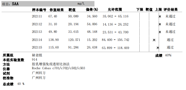 作者 | 沈素晶 陈淑芳 李蔼文 单位 | 广东省第二中医院检验科 室间质量评价(externalqualityassessment,EQA)可为实验室提供外部质量评价,也是卫生行政主管部门和医院管理者对实验室质量监督的重要工具,目前已作为医院绩效考核的指标之一,也是实施检验结果互认的重要手段;因此,室间质评的结果深受检验人的重视。 室间质评计划的成绩要求是 80% 以上为可接受成绩,当收到一份不满意的 EQA 成绩大家都很紧张,但这就代表实验室该项目的检验质量有问题吗?我们又要采取怎样的纠正措施? 案例经过 5 月初的某一天,笔者如常上班,看看日历,估算血清淀粉样蛋白 A(SAA)的第一次卫生部质评的成绩差不多出来,打开网站一看,傻眼了,才 40 分!细看成绩基本都在允许范围上限,都是偏高的(如图 1)。 立即翻看当天质控记录,4 月 9 号质控在控,而且整个月质控稳定良好(图 2)。再翻查当天发出的结果,除质控和质评物并无检测患者标本(该项目平时开单就少)(图 3),一颗心稍稍放一下。面对如此惨不忍睹的 EQA 成绩,笔者决定求根究底。 案例分析 根据 CNAS CL-02(ISO15189:2012)5.6.3.1 参加实验室间比对:实验室应参加适于相关检验和检验结果解释的实验室间比对计划(如外部质量评价计划或能力验证计划)。实验室应监控实验室间比对计划的结果,当不符合预定的评价标准时,应实施纠正措施。 因此,当某个项目的室间质评未通过时,我们应该从哪些方面分析其原因? 根据质量管理的六要素「人、机、料、法、环、测」,从室间质评结果的综合情况分析,主要对人员操作、试剂、仪器、质控、校准、保养等方面加以分析。 1. 排除人为因素:首先查看上报的数据有无填错(如数据顺序、单位、网报时输入错误等),接着方法学和分组上有无错误。科室使用的生化仪为 Roche702,SAA 使用的是开放试剂,试剂、校准品及质控均是广州某生物公司生产的,方法学是乳胶增强免疫透射比浊法。 2. 试剂:存放冰箱温度 2 ~ 8 度,使用均在有效期内,开瓶后使用按照说明书上时间,更换批号均有校准,而且标本比对均在允许范围内,排除批间差异引起失分。 3. 仪器:每年定期校准,每天和每周均有保养,上半年并未发生较大故障,检测当天光源稳定,室内温湿度也达标。 4. 观察室内质控有无趋势性变化:如图 4,2021 年 1 ~ 8 月质控 CV 变化情况不大,均在实验室自己设置的质量目标范围内。 图 4 2021 年 1 ~ 8 月 SAA 低值与高值质控 CV 波动情况 5. 重新将之前冰冻保存的质评标本检测:结果差异不大,排除室间质评物不稳定情况。 6. 查看与其他炎症指标的吻合情况:随机选取 4 月份 5 个患者同一天 SAA 与 PCT、超敏 CRP 的联动情况,符合患者病情变化,如表 1。 那到底是什么原因引起该项目 EQA < 80 呢?经组长提醒,笔者留意到上报网站的临检中心数据分析。经查看,当时上报质评数据最终是归在缺省组,该项目共有 174 家实验室归于缺省组,及格率在 73% ~ 84% 之间(图 5)。而使用跟我们相同公司试剂的实验室的只有 6 家(图 6)其变异系数在 6.7% ~ 18.59% 之间,而按检测仪器上报则有 23 个实验室(图 7),变异系数也在 16.6% ~ 25.07% 之间。 最后,经对比我们实验室所上报数据与按试剂和仪器分组的上报均值相近,这也解释了我们实验室结果偏倚较大的原因。由于缺省组包含不同的仪器和试剂,方法学自然也不尽相同,强硬把这些数据混在一起再统计均值,中位数及标准差必然造成结果的的差异甚至不可比。 到此,谜底揭开,程序上也可以跟领导「交差」了。但是事情并未结束,因为后续还有质评,分组依然在缺省组,该项目的外部质量该如何监测?为此笔者联系厂家咨询,让他们拿数据分析,果然一个月后事情有了转机。 六月初,试剂厂家联系笔者,告知他们经过重新溯源,已重新配置新的定标物和质控品,并寄到科室重新定标。定标液浓度从原来的 145mg/L 变为 108mg/L,6 月 16 号经重新校准做质控,重测卫生部质评物,结果质控在控,质评物浓度全部在上报范围内,即是满分!结果如下: 八月份科室也进行了第二次卫生部质评活动,经过验证,溯源还是很有用,质评成绩虽有偏倚也是满分的,结果如图 8。 总 结 溯源的含义是测量结果或标准量值的属性,它使测量结果或标准量值通过连续的比较链与给定的标准联系起来,给定的标准通常是国家或国际标准。生产 SAA 试剂公司的溯源链如图 9, 溯源报告见图 10。 为什么要溯源?日常工作中实验室里使用不同仪器或者不同的厂家试剂,同一份血清同一个项目出现偏倚不能接受的原因就是实验室没有实现标准化。 国外学者 MauroPanteghini 提出:溯源是医学实验室标准化(唯一)有效途径,量值溯源的一致性也是国际间相互承认结果的前提条件;中国合格评定国家认可委员会(简称 CNAS)将量值溯源视为测定结果可信性的基础。简而言之,溯源能解决检测的准确性问题。 总结本次室间质评过程,从对 EQA 结果的不接纳,追踪原因,重新溯源校准比对,最终找到原因,验证并解决问题。过程颇为曲折和耗时,但是也是值得的。 实际工作中每个实验室或多或少都使用了与检测仪器非配套的试剂和校准品,如何监测这些项目的准确性成为了难题。除了日常质控检测内部稳定性和准确性外,采用室间质评的方法难免遇到分组问题造成结果不可比。 因此,对此种情况的质评项目,笔者建议,一是上报时注意正确填写自己所使用试剂和方法学的