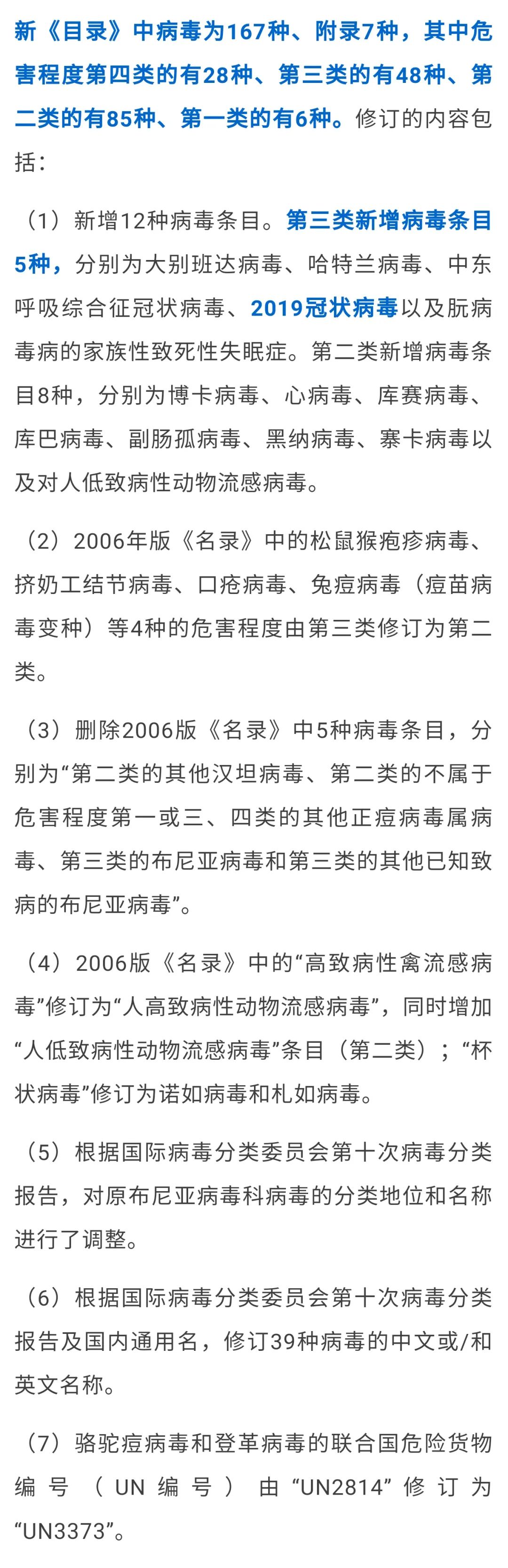 太长不看版 新《目录》的分类将与世卫组织的分类接轨,按病原微生物的危害程度由高到底分为第四类、第三类、第二类、第一类。其中,第四类有28种、第三类有71种、第二类有394种、第一类有6种,合计499种。 尽管过去我们战胜过几次病毒,但我们从来没有赢过细菌。 它们几乎是不可能被消灭的,人类和病原微生物的战争可能永远也不会结束。 对抗传感染病,还需要大家保持守脑如玉,一起努力,用人类的团结和智慧,保持持续胜利的态势。 图:国家卫健委发布《名录》征集意见稿 这两年,新冠肺炎疫情席卷全球,大家对致病微生物的关注度也空前高涨,日前,国家卫健委办公厅又发布了《人间传染的病原微生物目录》征求意见稿,尹哥也对其进行研读,今天就和大家一起看一看新旧目录有何异同。 新《目录》分类 新《目录》的分类将与世卫组织的分类接轨,按病原微生物的危害程度由高到底分为第四类、第三类、第二类、第一类(过去的分类由按危害程度由高到底分为第一类、第二类、第三类、第四类)。其中,第四类有28种、第三类有71种、第二类有394种、第一类有6种,合计499种。 图:《目录》修订前后各病原体数量及分类对比 修订的内容 病毒类 图:中东呼吸系统综合征冠状病毒 细菌类 图:土拉弗朗西丝菌(蓝色)感染巨噬细胞 真菌类 图:白色念珠菌 战火何时休 上一版《人间传染的病原微生物名录》是原国家卫生部于2006发布的,距今已经过去了16个年头,里面有不少老面孔,至今也还是人类的大麻烦,如埃博拉病毒、艾滋病毒等;也有不少老对手,现在才是《目录》的新面孔,比如这些年沸沸扬扬的中东呼吸综合征冠状病毒、新冠病毒等。更应该让人感到恐惧的是《目录》里数量庞大的真菌和细菌,要知道,尽管过去我们战胜过几次病毒,但我们从来没有赢过细菌。 都说有人的地方就有“江湖”,病原微生物们就是这样一个“江湖”,它们几乎是不可能被消灭的,人类和病原微生物的战争可能永远也不会结束。而新冠疫情更清醒的告诉我们,没有一个个体能在大流行中独善其身。对抗传感染病,还需要大家保持守脑如玉,一起努力,用人类的团结和智慧,保持持续胜利的态势。 尽管《目录》上的各种病原微生物越来越多,但尹哥还是衷心的希望,我们的麻烦可以越来越少。 - END - |