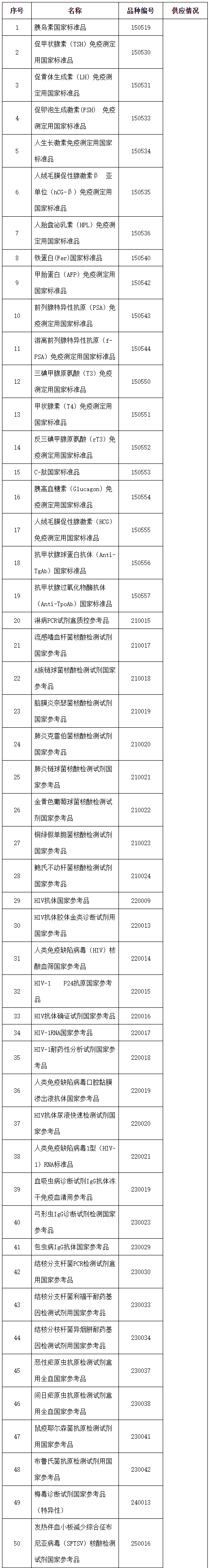 注: 1. *标识品种为本期目录新增体外诊断试剂标准物质。 2. ▲标识品种为可用于体外诊断试剂检验的化学对照品。 3. 相关品种电子版说明书可到中国食品药品检定研究院网站http://aoc.nifdc.org.cn/sell/home/search.html,点击目录查询,进行在线浏览。 4.限制供应是指仅供给相关体外诊断试剂生产企业。 5.《注册检验用体外诊断试剂国家标准品和参考品目录(第十一期)》发布之日起,《注册检验用体外诊断试剂国家标准品和参考品目录(第十期)》同时废止。