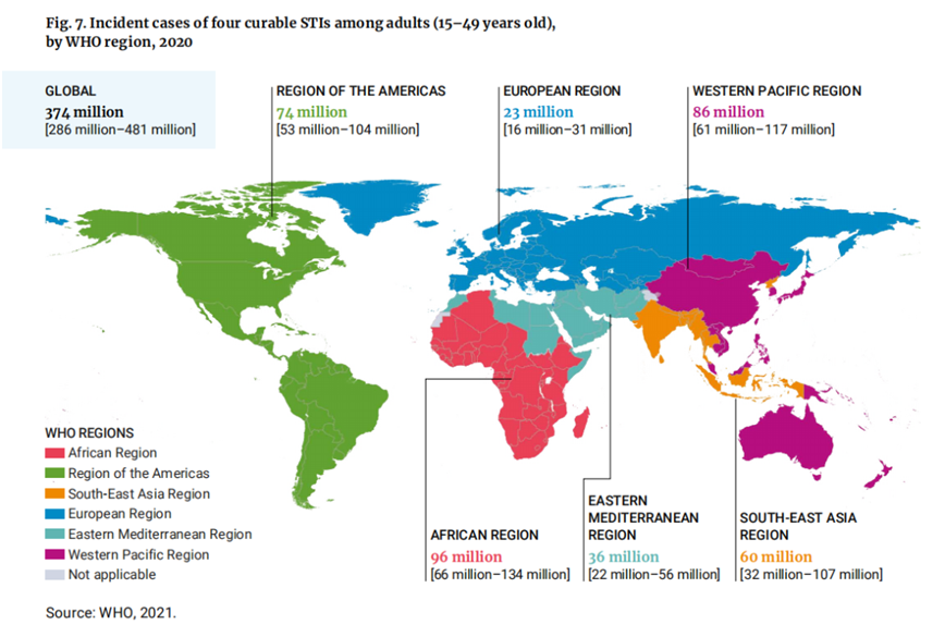 2021年WHO发布的最新《HIV, 肝炎和性传播疾病的全球进展报告》中显示,全球每年新发约3.74亿性传播感染病例,其中沙眼衣原体为1.28亿左右。全球15-49岁女性和男性人群CT感染的平均患病率分别为3.8%和2.7%。但由于新冠疫情所致,可能存在许多未上报的数据。