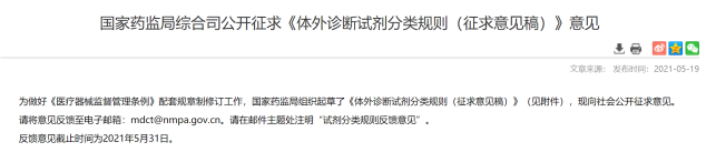 出于这种方面的考虑,在办法里做了这样的修订,NMPA为了进一步做好体外诊断试剂产品相应分类的工作,配合试剂办法的出台,在今年5月19日发布了《体外诊断试剂分类规则(征求意见稿)》,向全社会公开征求意见。