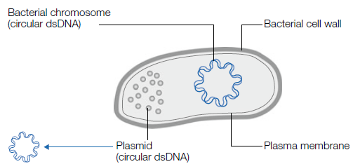细菌细胞中可存在两种类型的DNA。染色体几乎总是一个圆形分子,由(平均)60-500万bp*组成。此外,还可能出现小的圆形DNA分子,即所谓的质粒。这些分子的大小可能从几千到几十万个核苷酸不等,这取决于细菌种类和质粒的类型