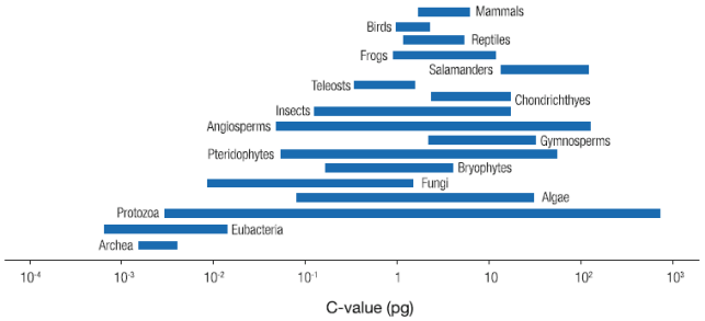 图1|与倍性相关的基因组C值*;单倍体(1N)基因组的DNA重量(pg)**。