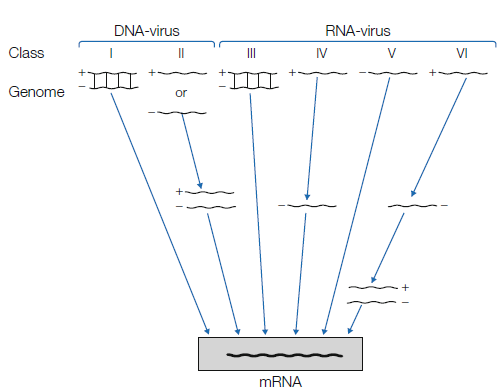 病毒是根据其遗传物质分类的(所谓的巴尔的摩分类法,图3)。第一类病毒含有双链DNA,在细胞质中进行复制。